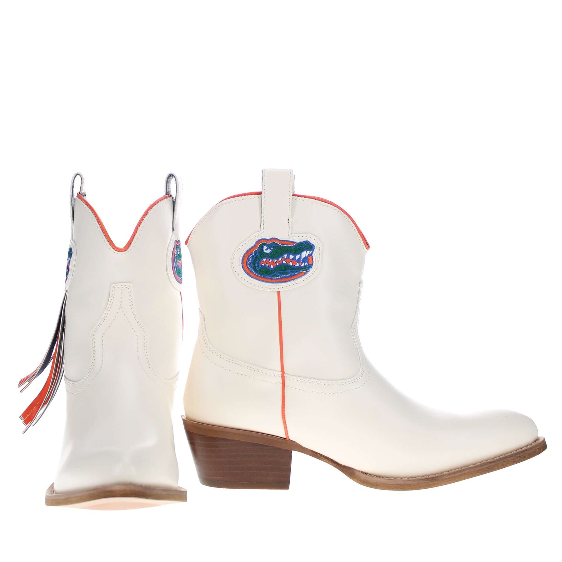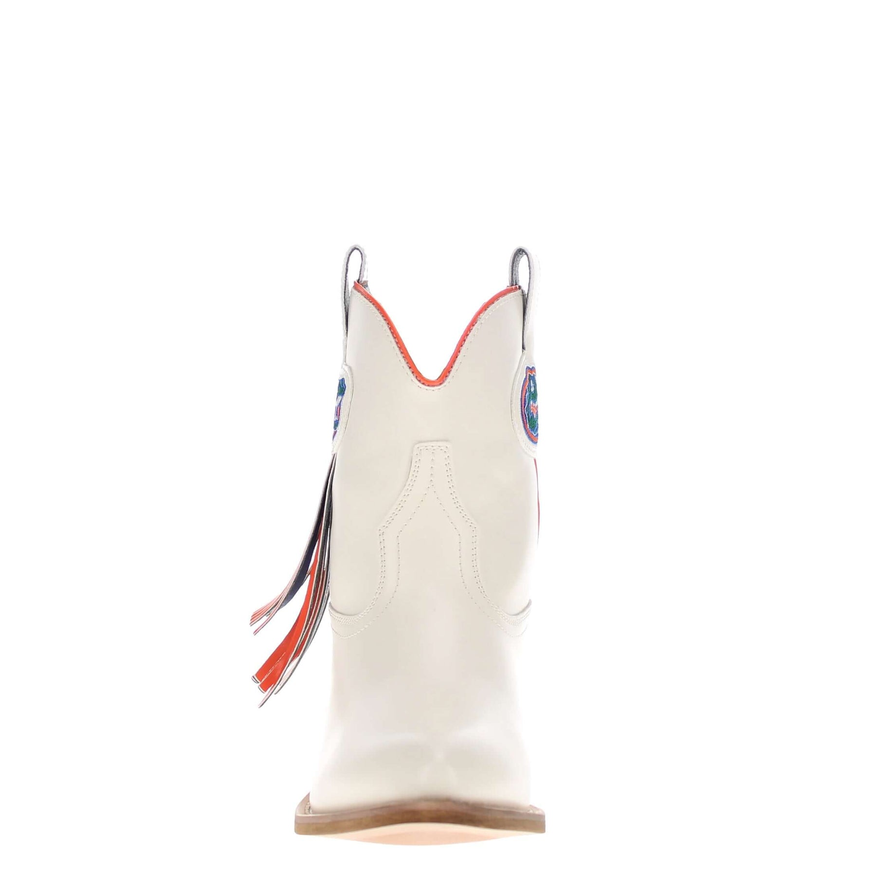 Meet the Lucy, a bold new take on western tradition. Officially licensed for The University of Florida. The Lucy pairs sleek bone PU leather with the Florida gators logo and playful fringe for a standout game day look. With its modern silhouette and stacked heel, this boot delivers both comfort and style for every occasion. Go Gators!