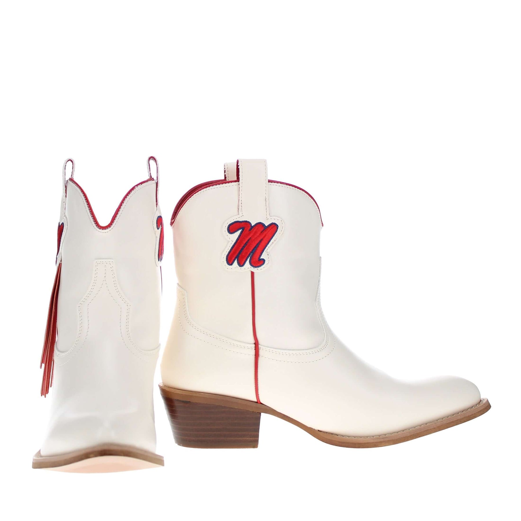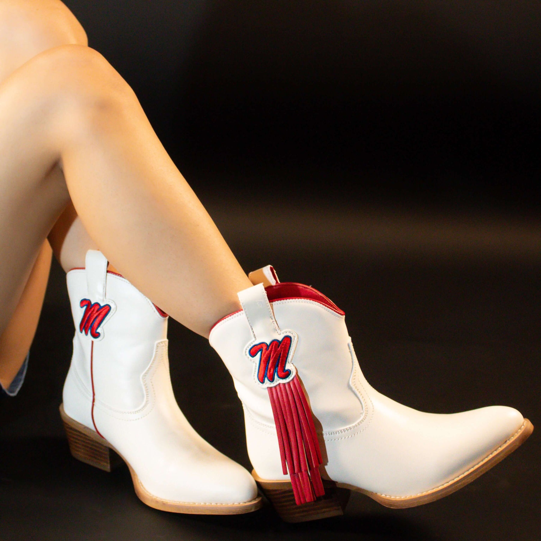 Meet the Lucy, a bold new take on western tradition. Officially licensed for The University of Mississippi. The Lucy pairs sleek bone PU leather with the Ole Miss logo and playful fringe for a standout game day look. With its modern silhouette and stacked heel, this boot delivers both comfort and style for every occasion. Hotty Toddy!
