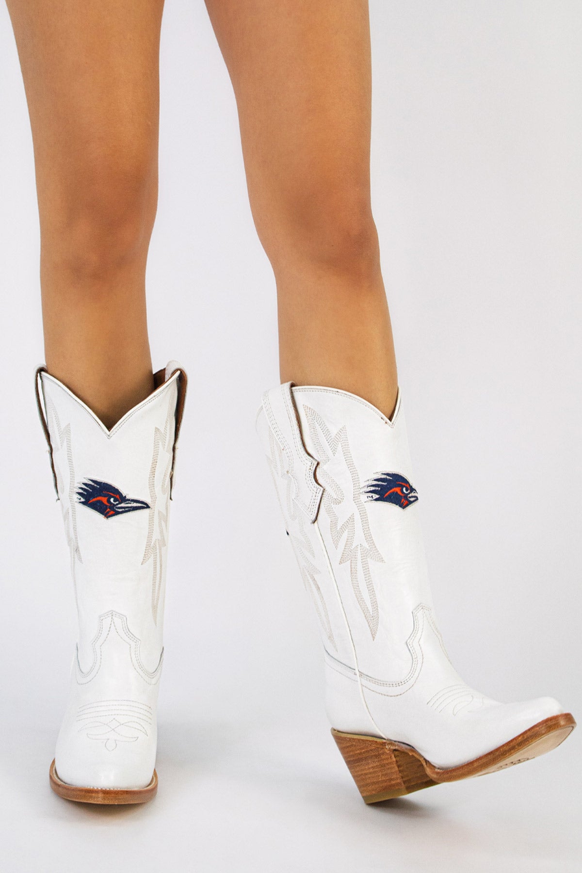 Meet the Lucy, a bold new take on western tradition. Officially licensed for The University of Texas at San Antonio. The Lucy pairs sleek bone PU leather with the UTSA logo and playful fringe for a standout game day look. With its modern silhouette and stacked heel, this boot delivers both comfort and style for every occasion. Birds Up!