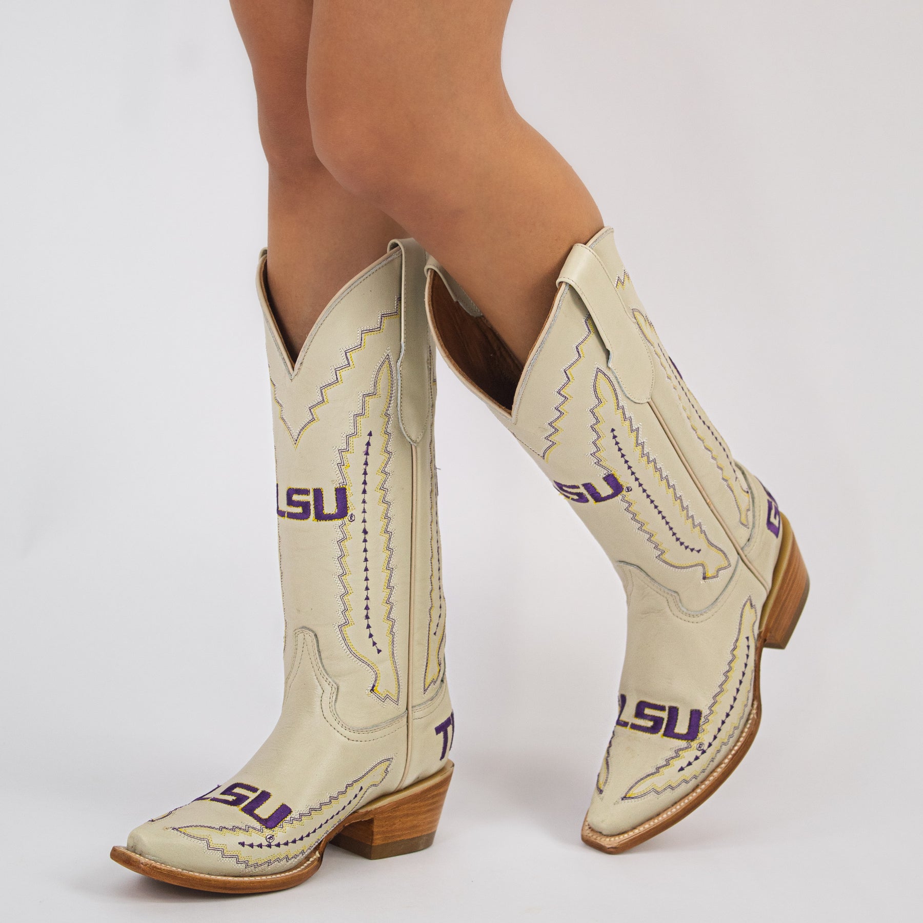 Our best seller for a reason, The Naomi is the perfect mix of school pride and Southern charm. Featuring vibrant LSU purple and gold stitch patterns and officially licensed logos, these boots are designed to stand out on game day and beyond. More than just footwear, they’re a bold expression of your Tigers spirit with every step. Geaux Tigers!