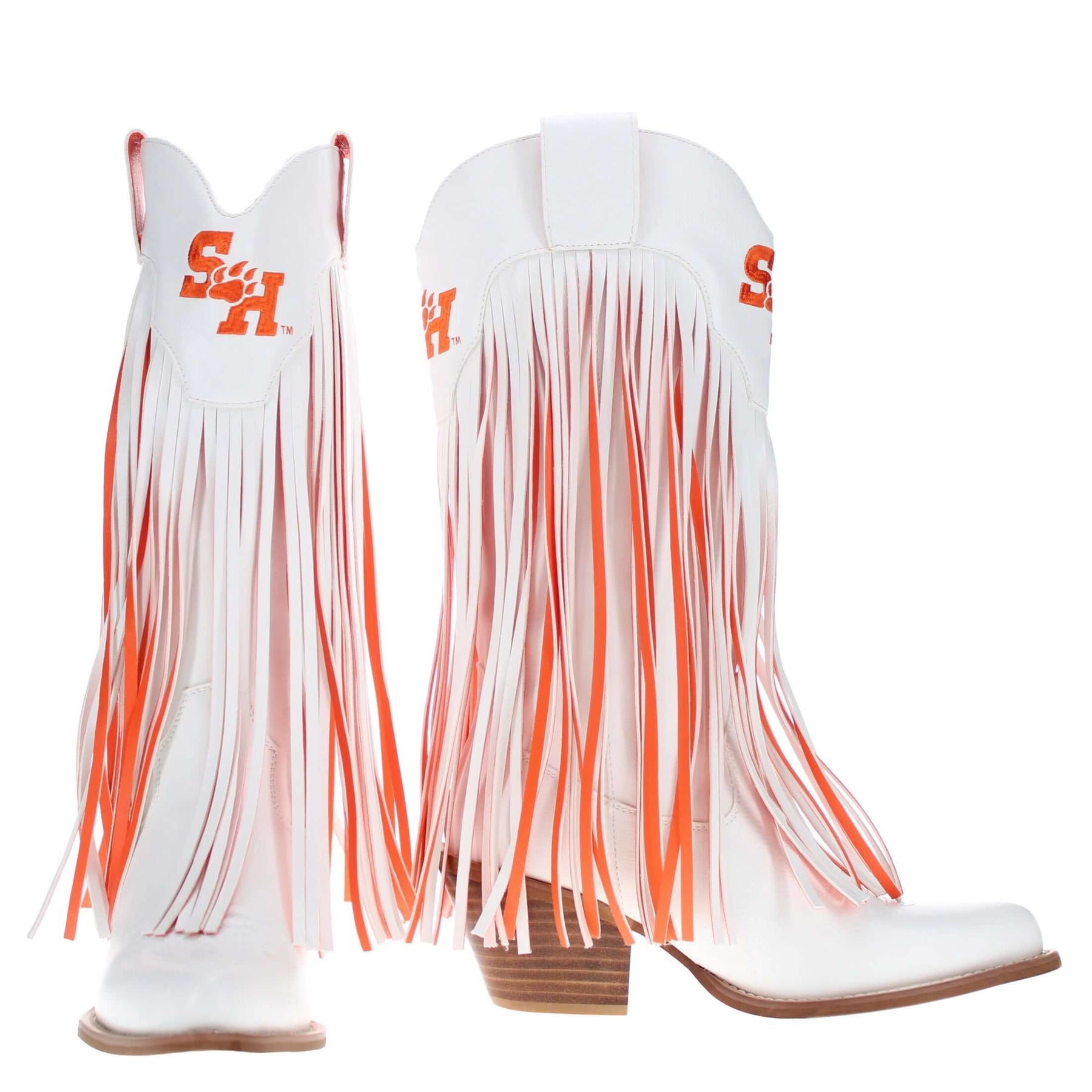 Show your Bobkats pride in style with the Kacey cowgirl boots, officially licensed for Sam Houston State University. Featuring playful fringe that reveals bold school colors, these PU leather boots are a fun, budget-friendly way to stand out at tailgates or on the dance floor.