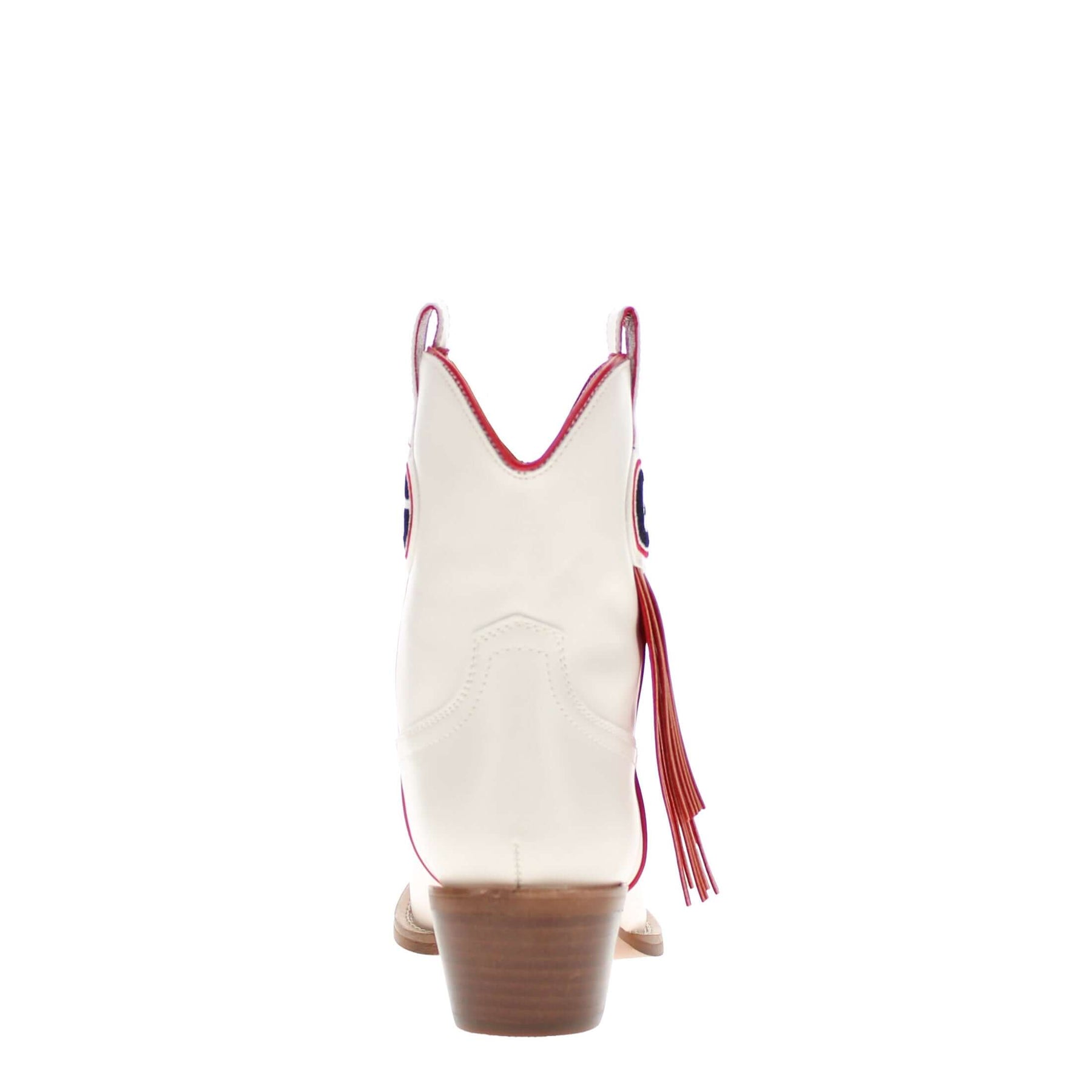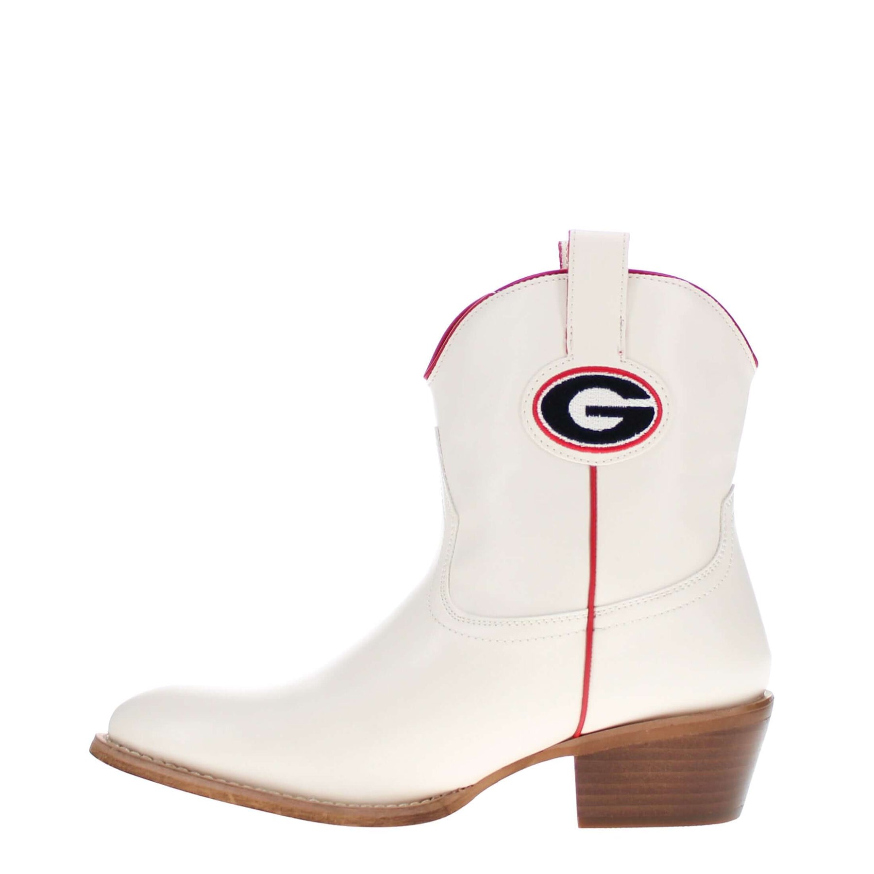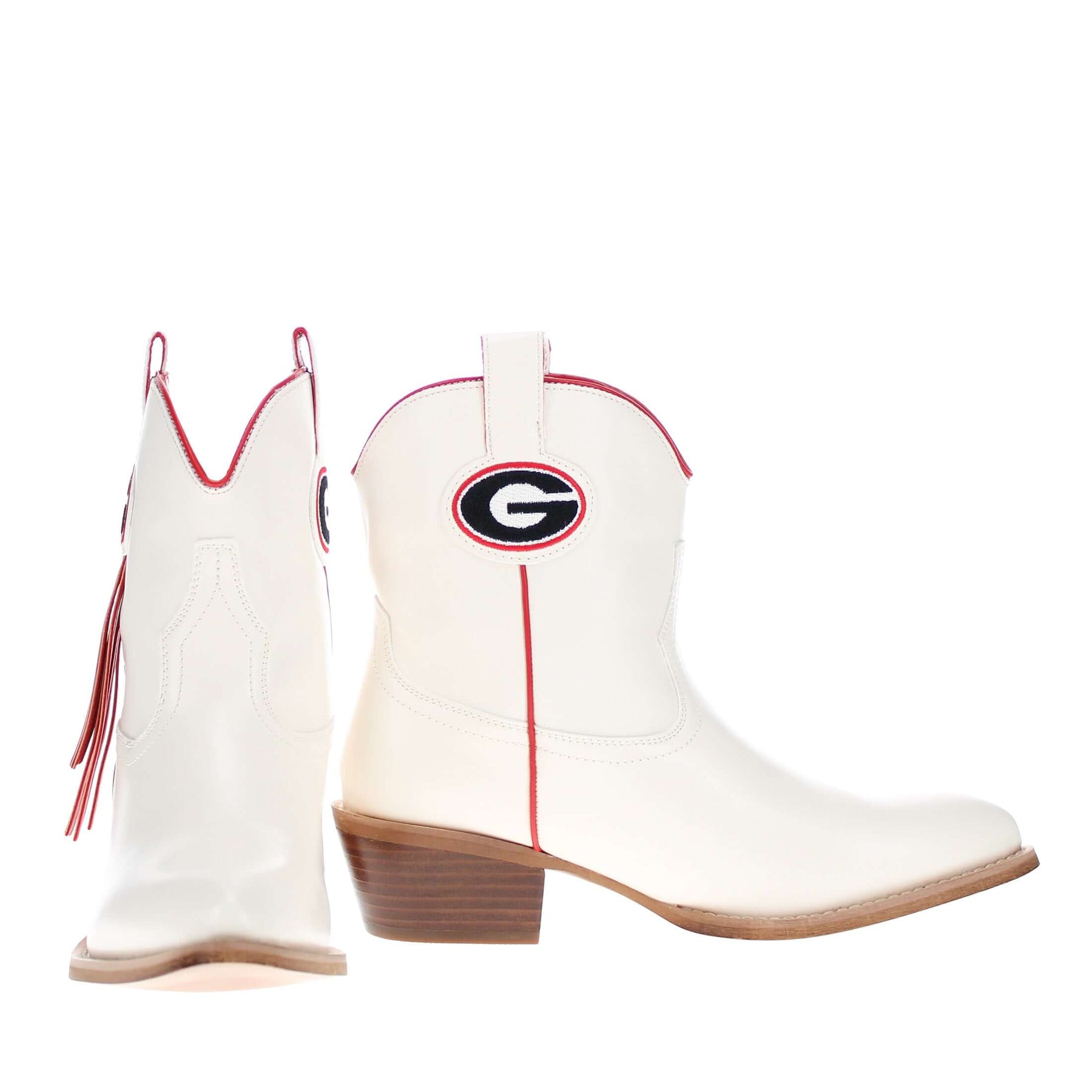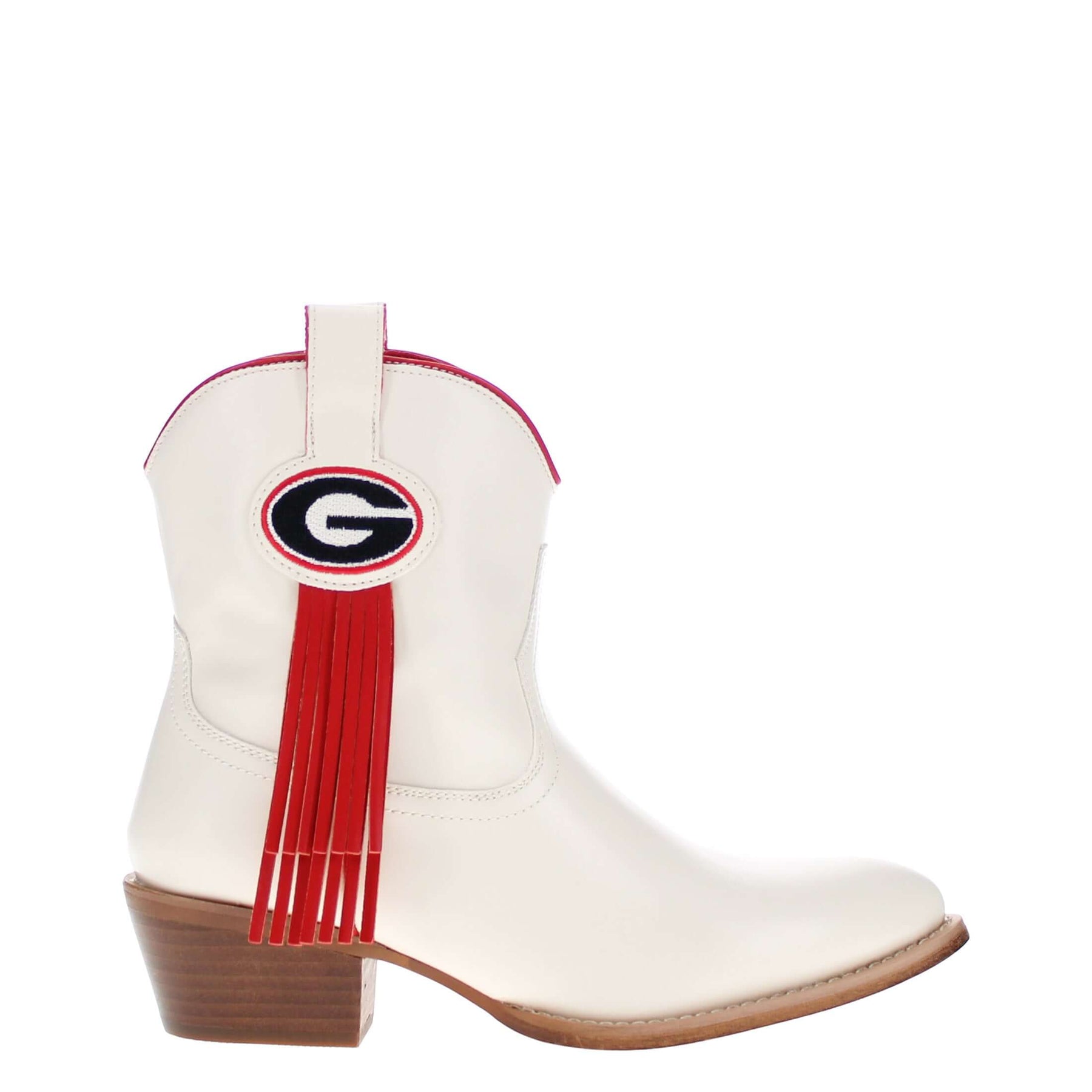Meet the Lucy, a bold new take on western tradition. Officially licensed for The University of Georgia. The Lucy pairs sleek bone PU leather with the Georgia logo and playful fringe for a standout game day look. With its modern silhouette and stacked heel, this boot delivers both comfort and style for every occasion. Go Dawgs!