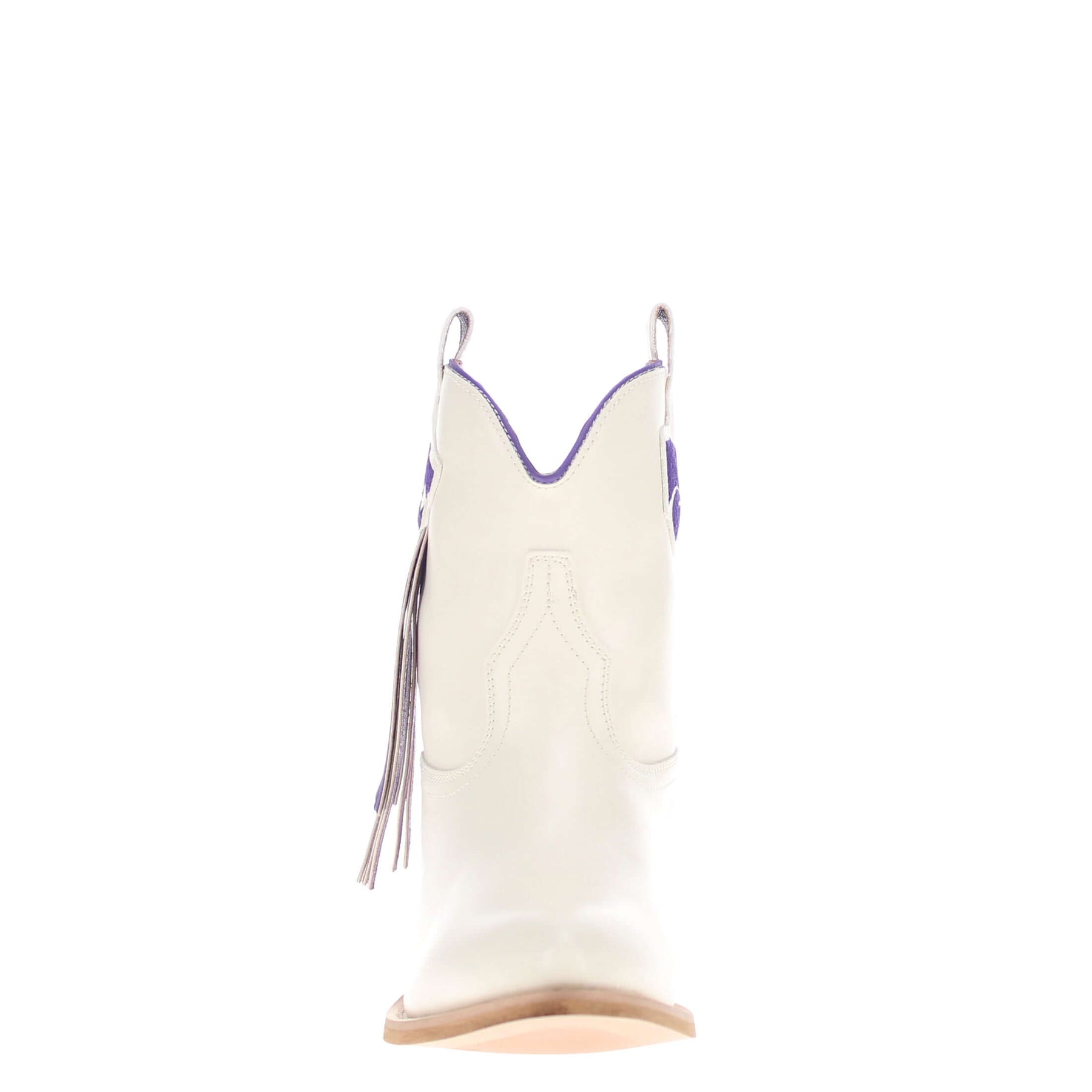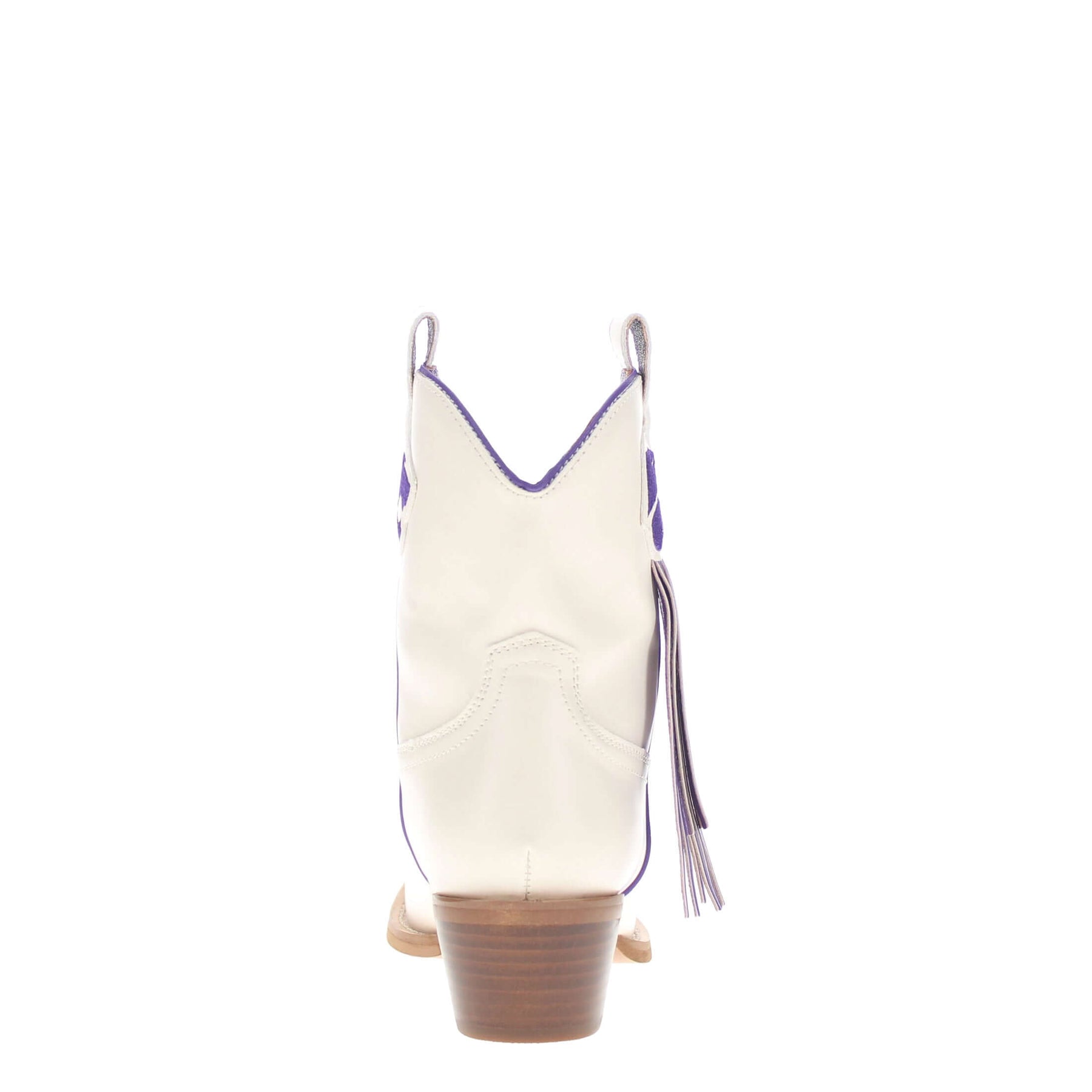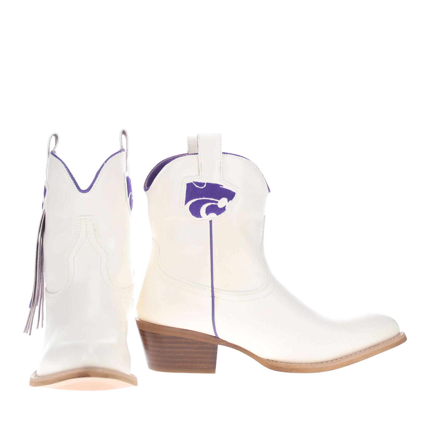 Meet the Lucy, a bold new take on western tradition. Officially licensed for Kansas State University. The Lucy pairs sleek bone PU leather with the Kansas State logo and playful fringe for a standout game day look. With its modern silhouette and stacked heel, this boot delivers both comfort and style for every occasion. Go Wildcats!