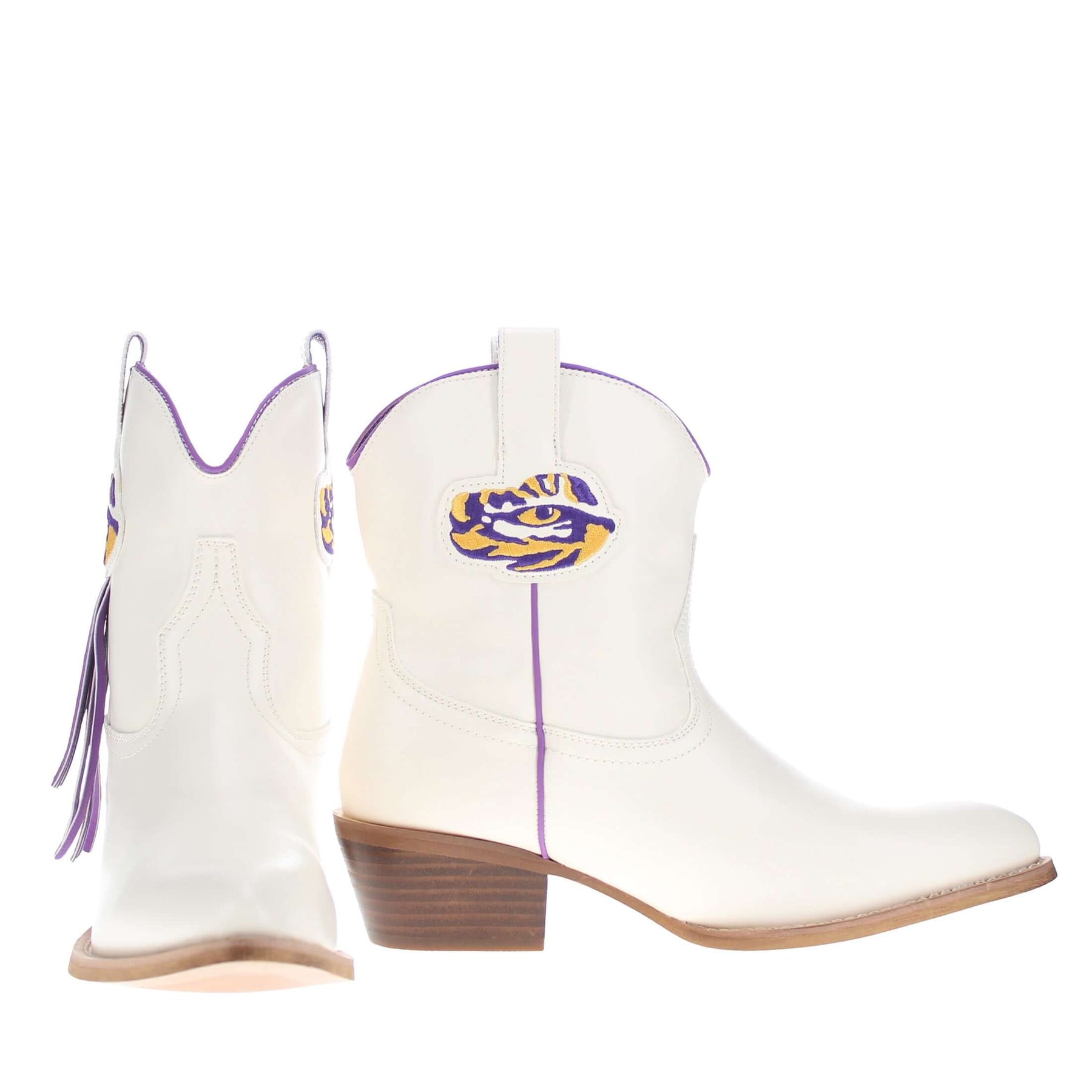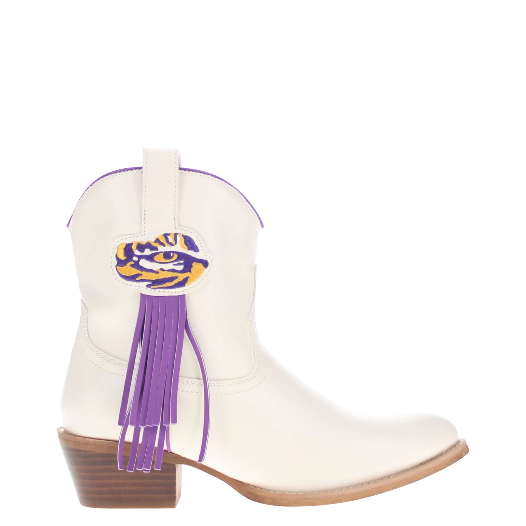 Meet the Lucy, a bold new take on western tradition. Officially licensed for Louisiana State University. The Lucy pairs sleek bone PU leather with the LSU logo and playful fringe for a standout game day look. With its modern silhouette and stacked heel, this boot delivers both comfort and style for every occasion. Geaux Tigers!