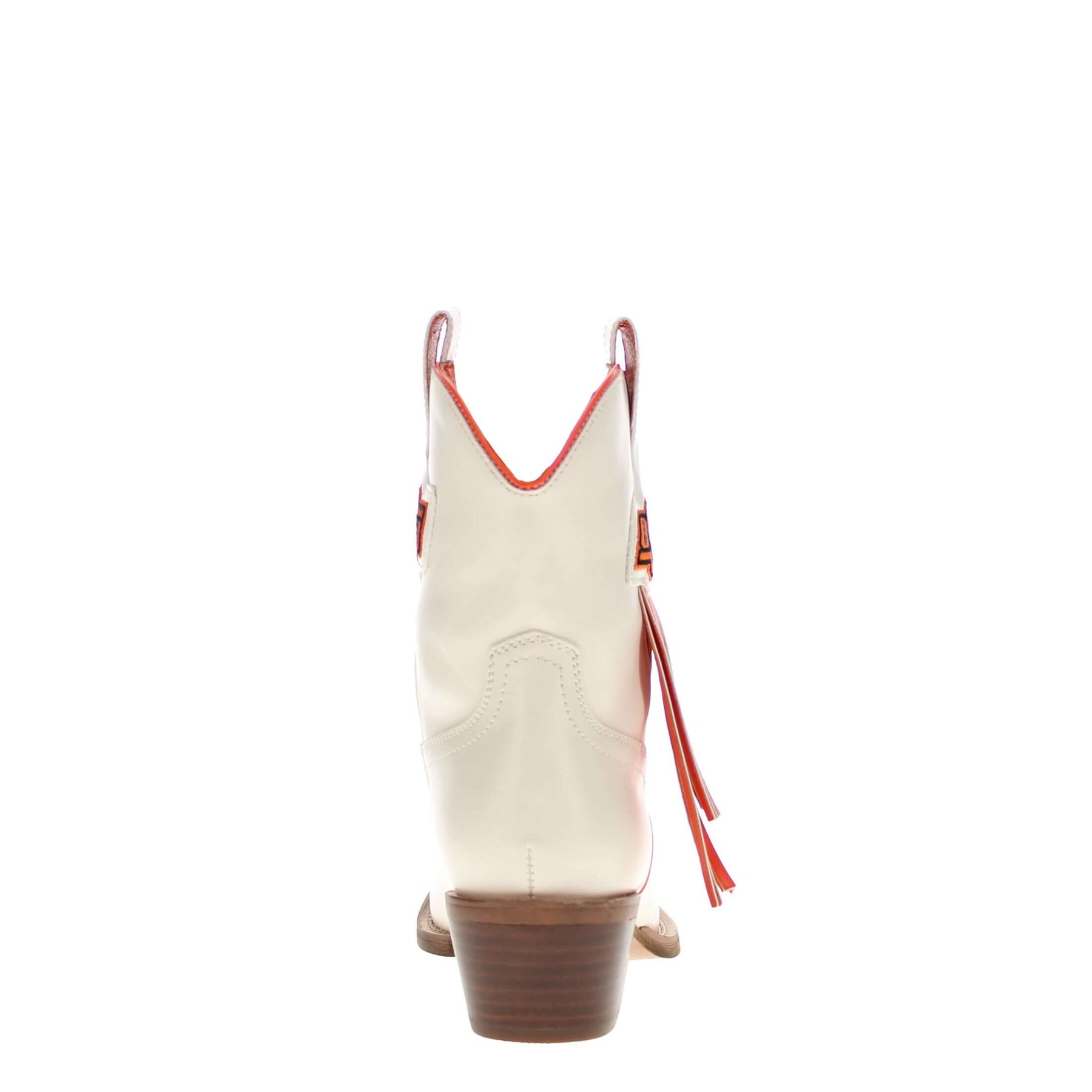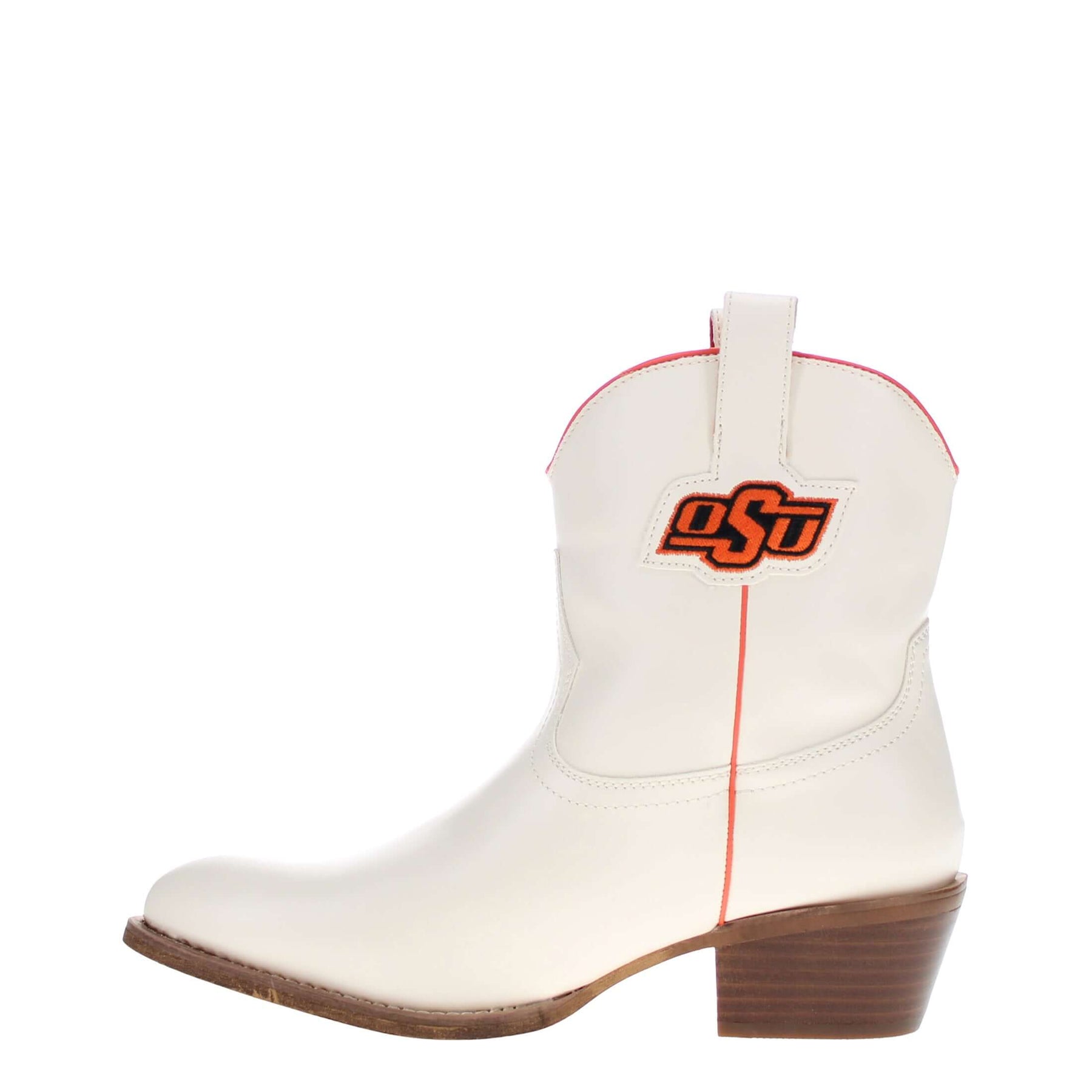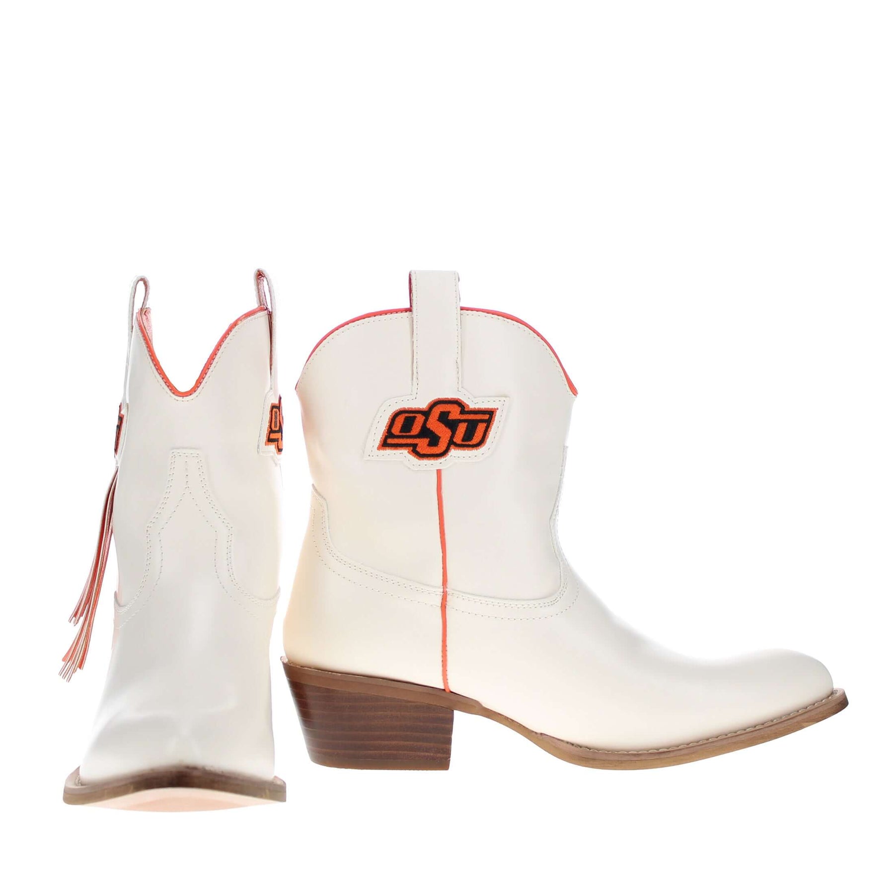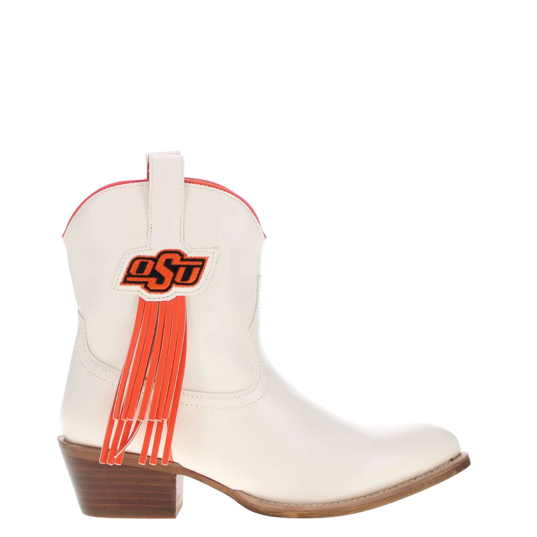 Meet the Lucy, a bold new take on western tradition. Officially licensed for Oklahoma State University. The Lucy pairs sleek bone PU leather with the OSU logo and playful fringe for a standout game day look. With its modern silhouette and stacked heel, this boot delivers both comfort and style for every occasion. Go Pokes!