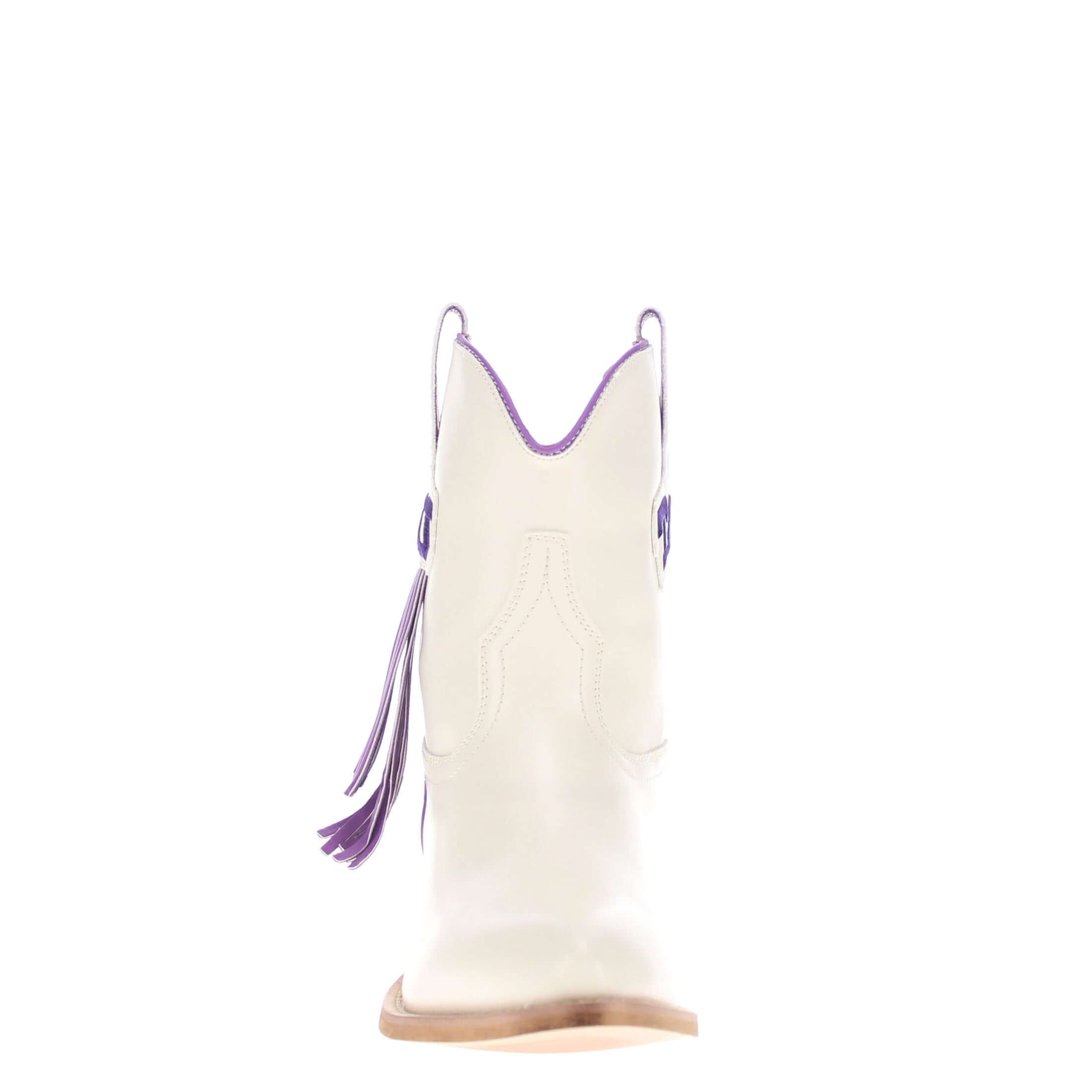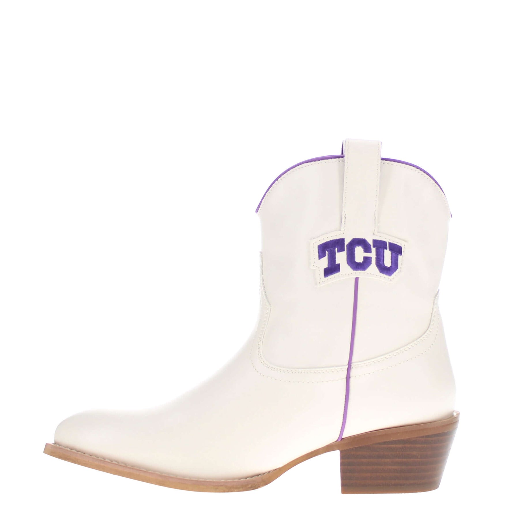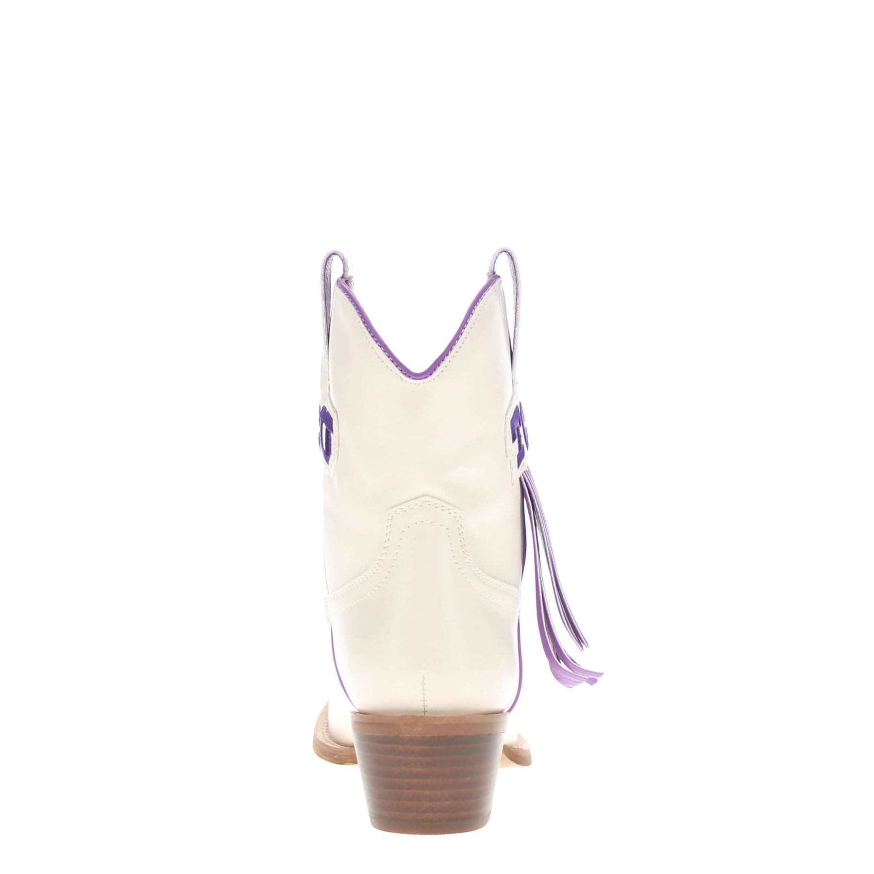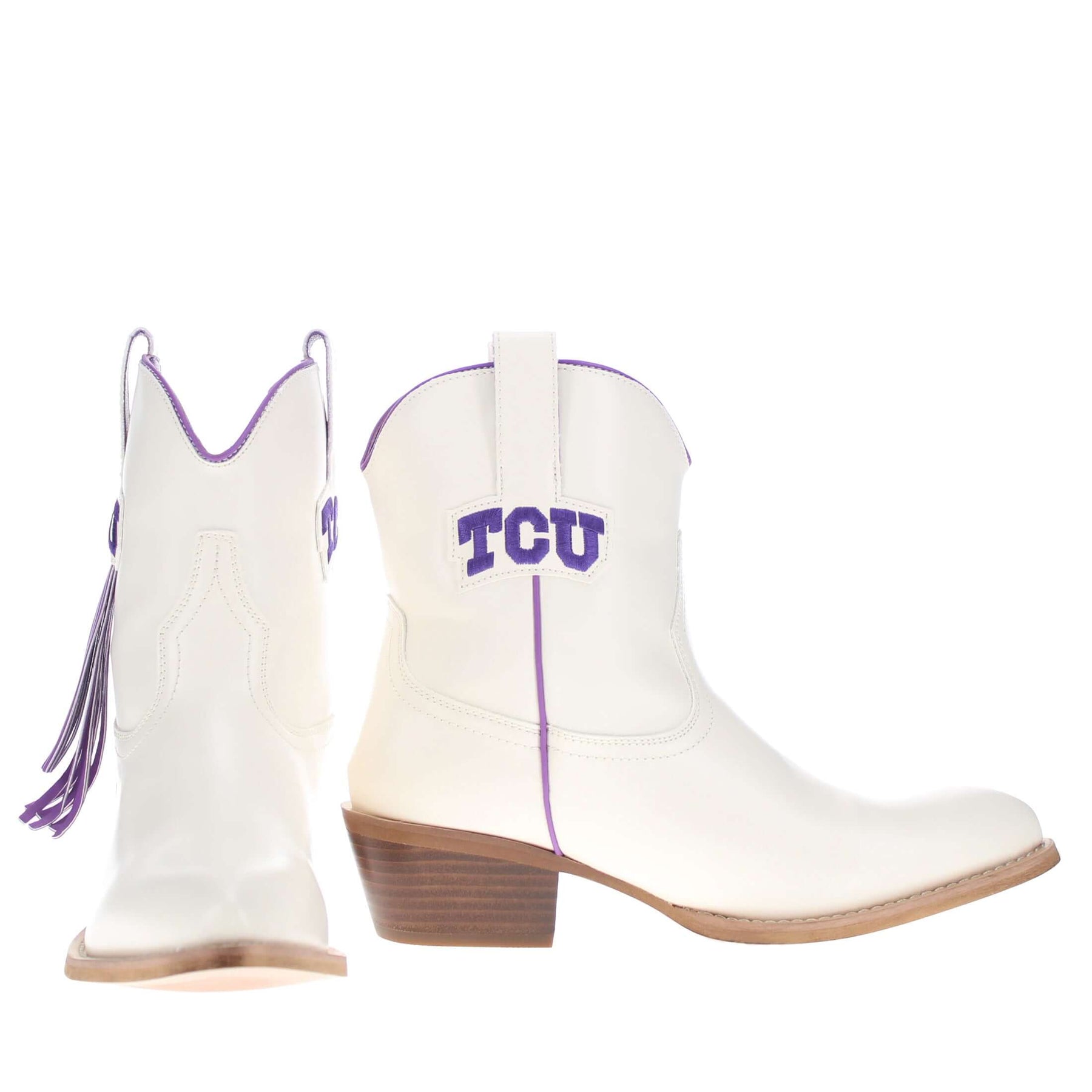 Meet the Lucy, a bold new take on western tradition. Officially licensed for Texas Christian University. The Lucy pairs sleek bone PU leather with the TCU logo and playful fringe for a standout game day look. With its modern silhouette and stacked heel, this boot delivers both comfort and style for every occasion. Go Frogs!