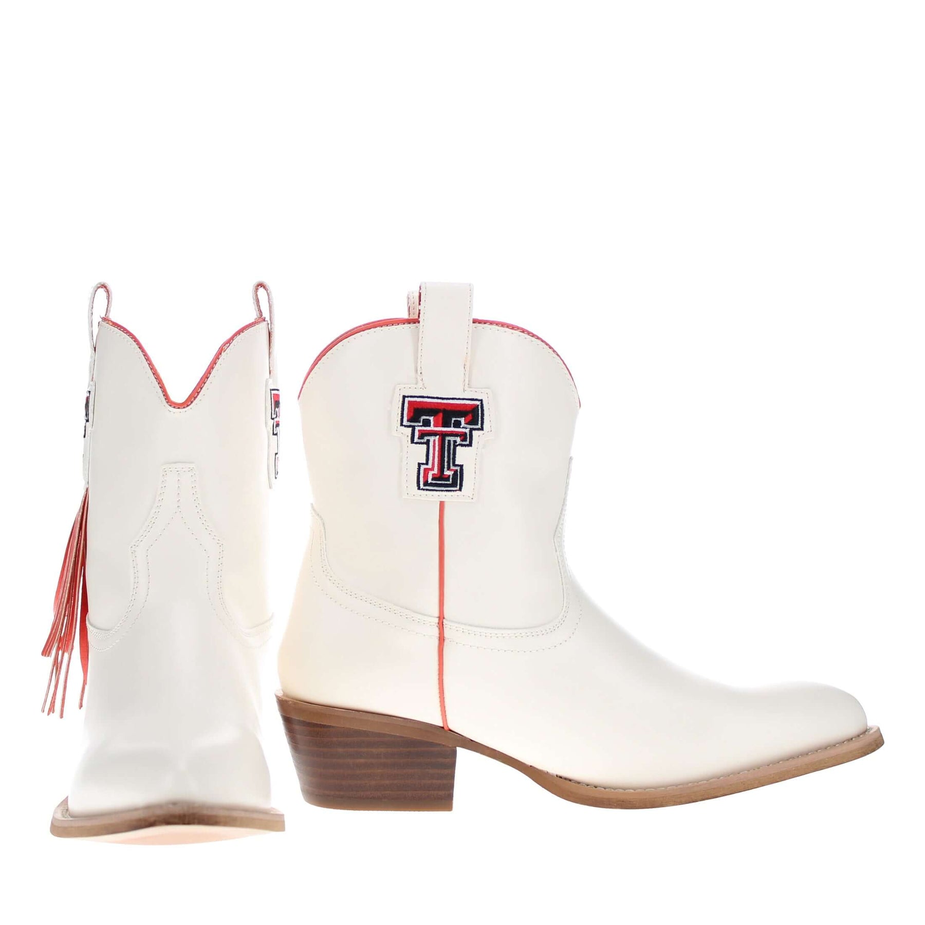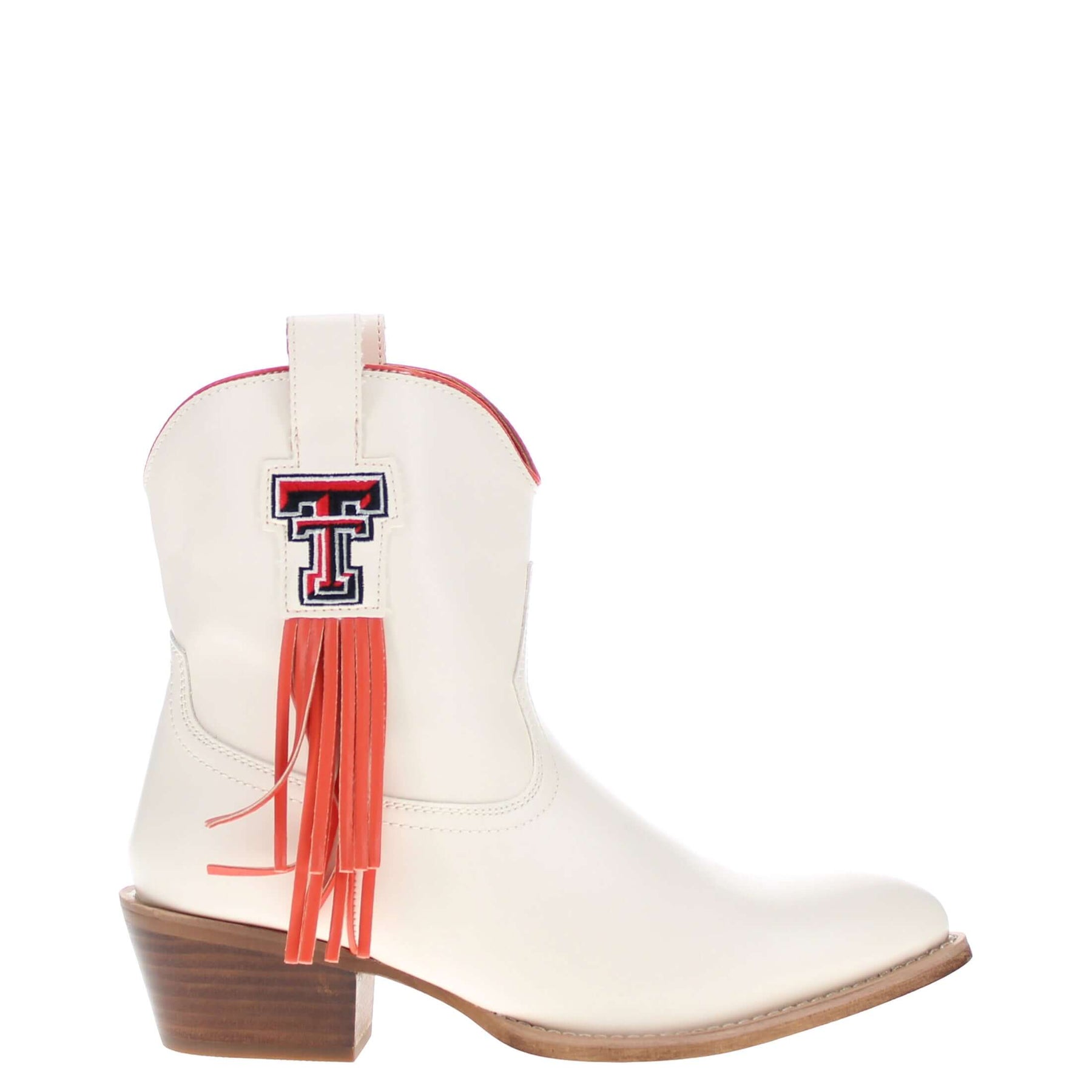 Meet the Lucy, a bold new take on western tradition. Officially licensed for Texas Tech University. The Lucy pairs sleek bone PU leather with the Tech logo and playful fringe for a standout game day look. With its modern silhouette and stacked heel, this boot delivers both comfort and style for every occasion. Wreck 'em Tech!