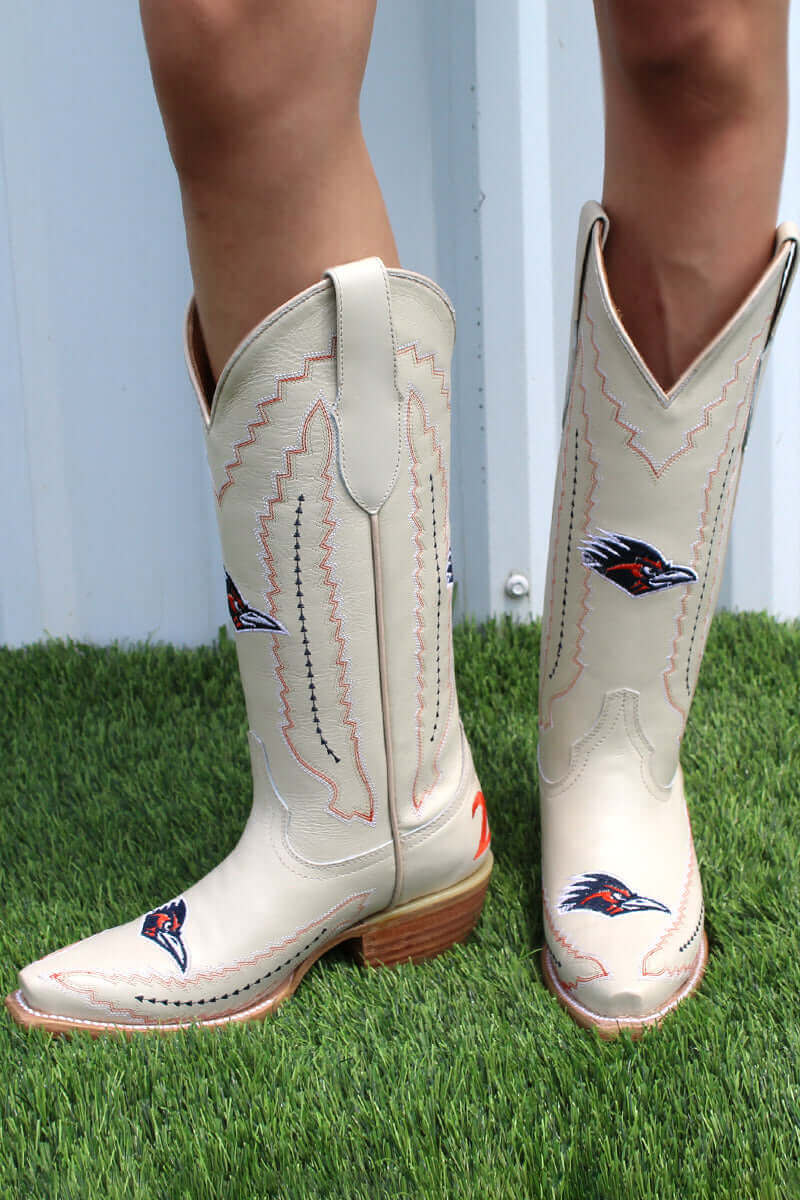 Officially licensed for the University of Texas at San Antonio, the Natalie booties are inspired by the fan favorite, Naomi. With an easy slip-on design, they're perfect for warmer weather and stylishly repping your school spirit. Lets Go 210!