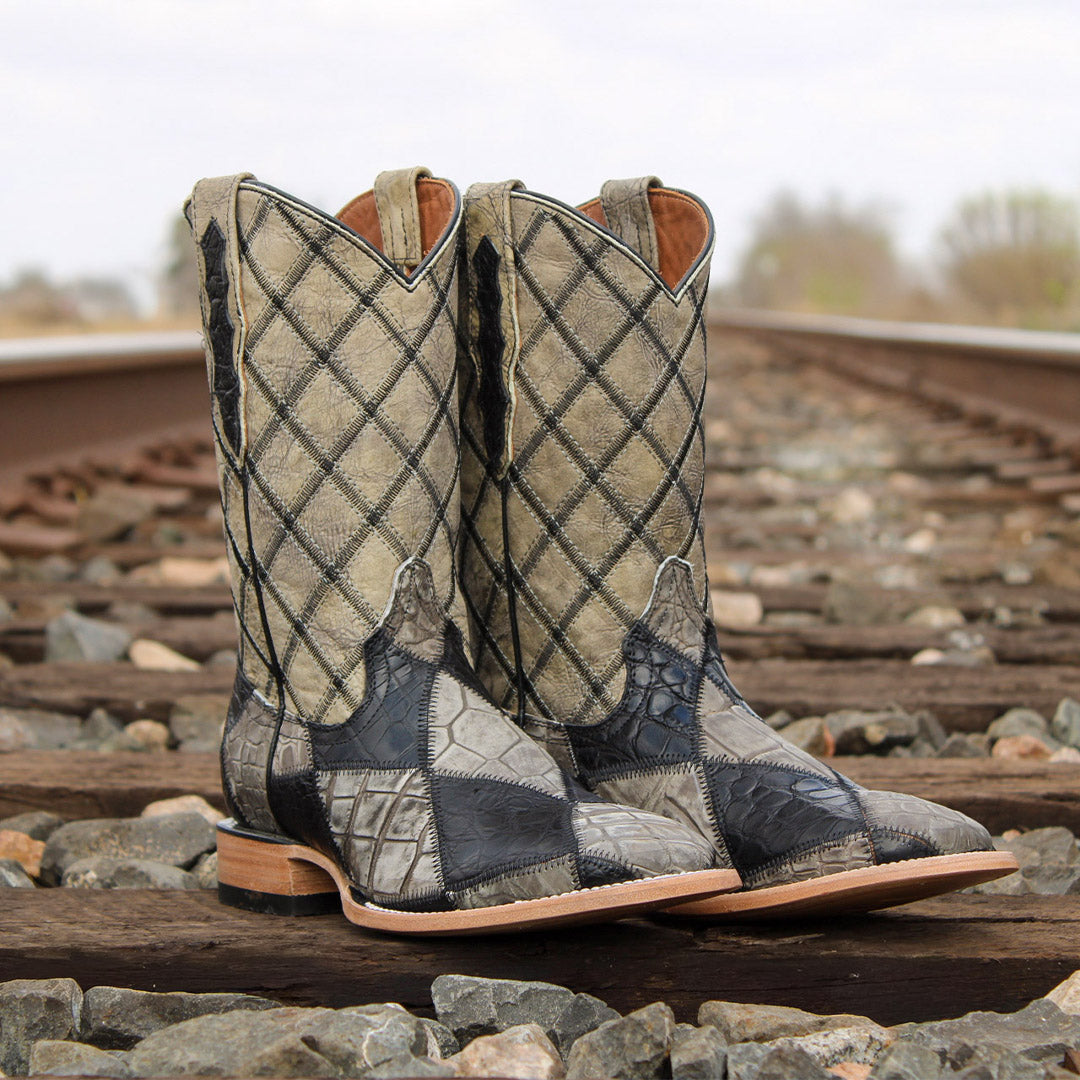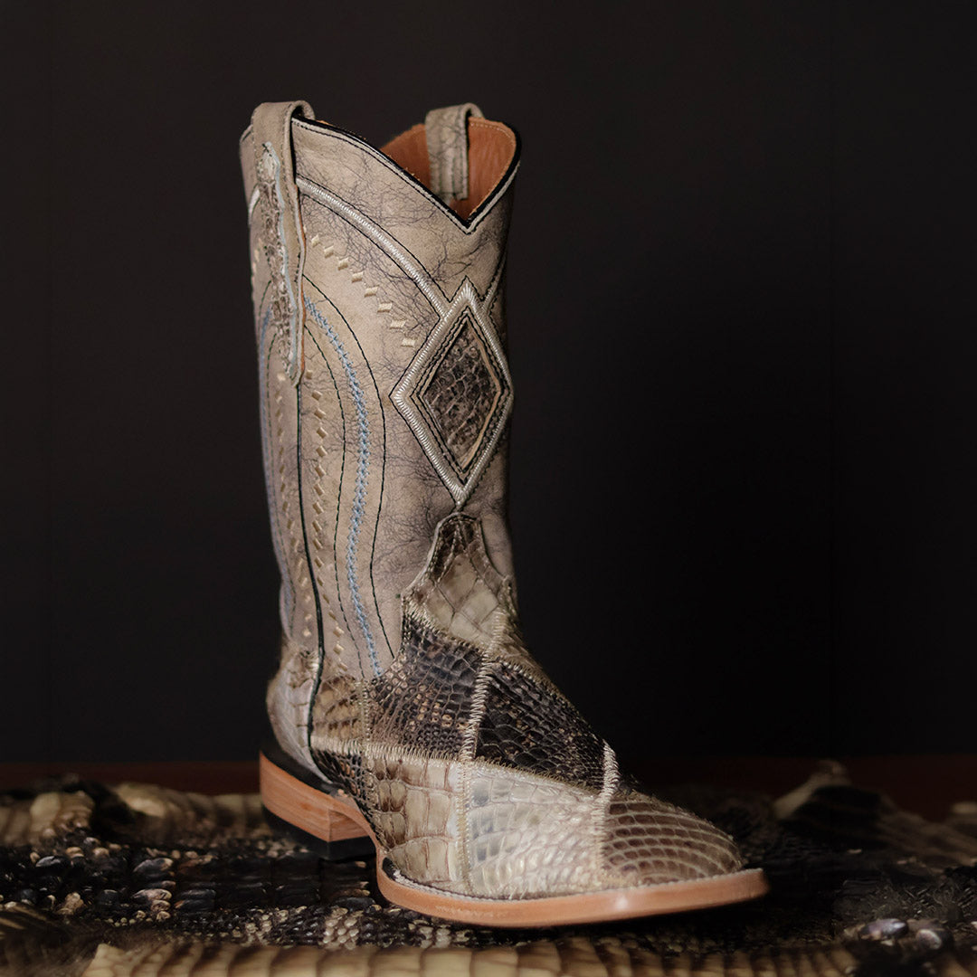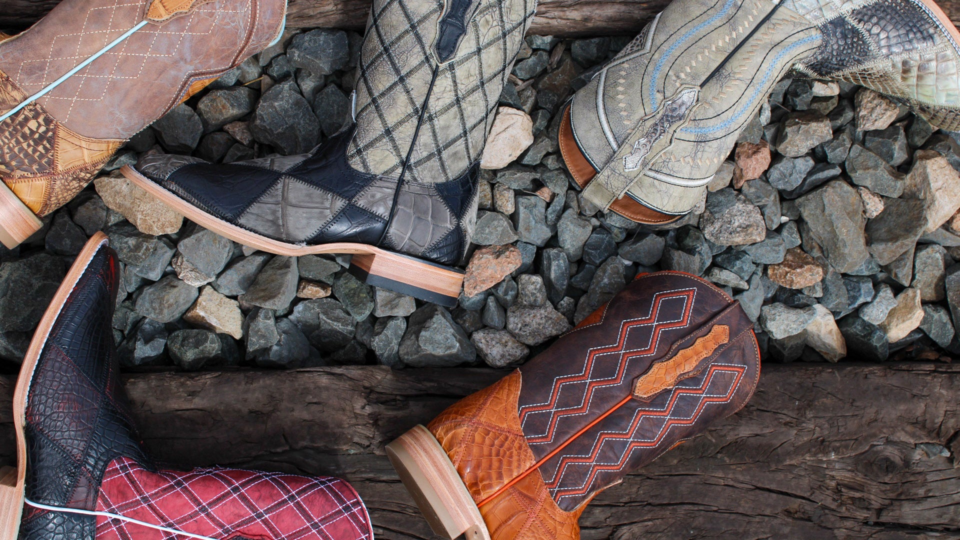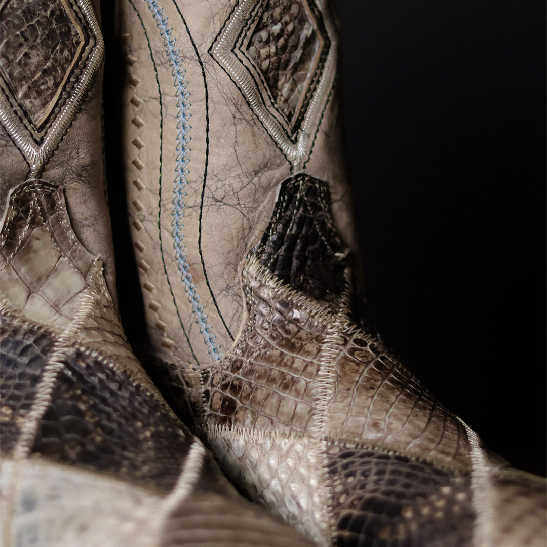 Hand-selected tiles of natural American alligator come together to create The Beau — a striking patchwork cowboy boot rooted in Western tradition. Each piece is carefully arranged to form a rich mosaic of textures and tones, making every pair uniquely its own.