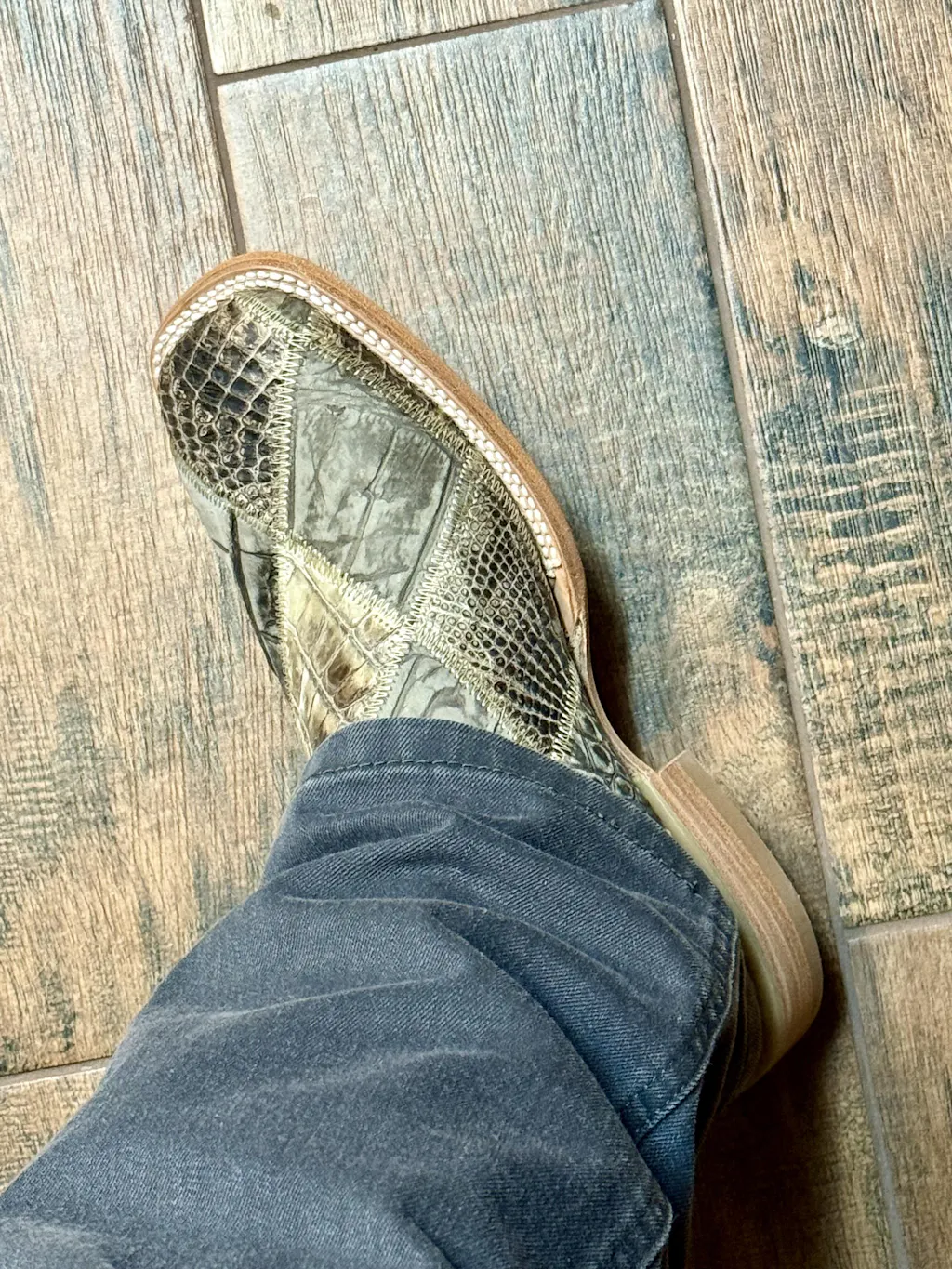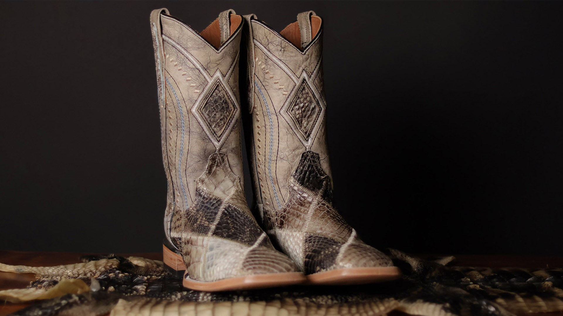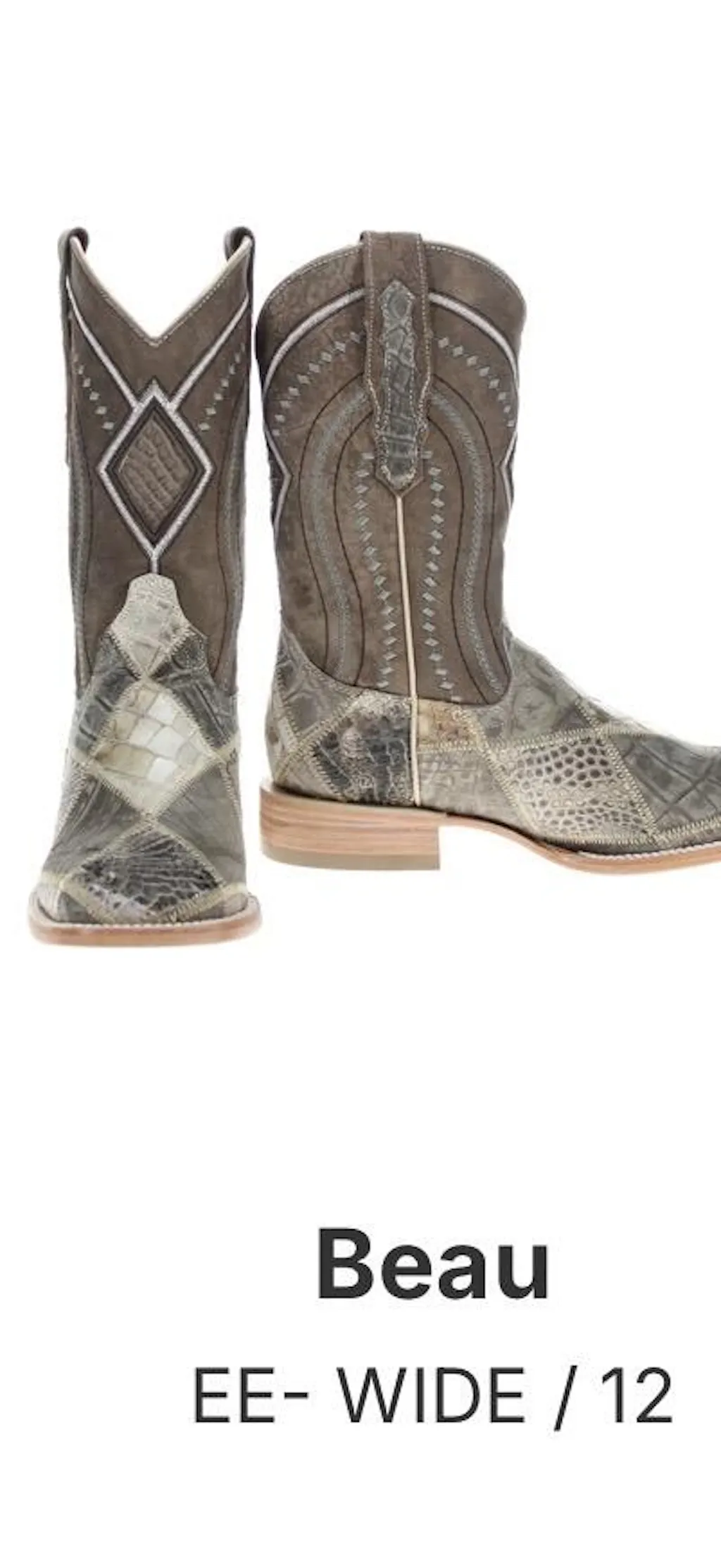 Hand-selected tiles of natural American alligator come together to create The Beau — a striking patchwork cowboy boot rooted in Western tradition. Each piece is carefully arranged to form a rich mosaic of textures and tones, making every pair uniquely its own.