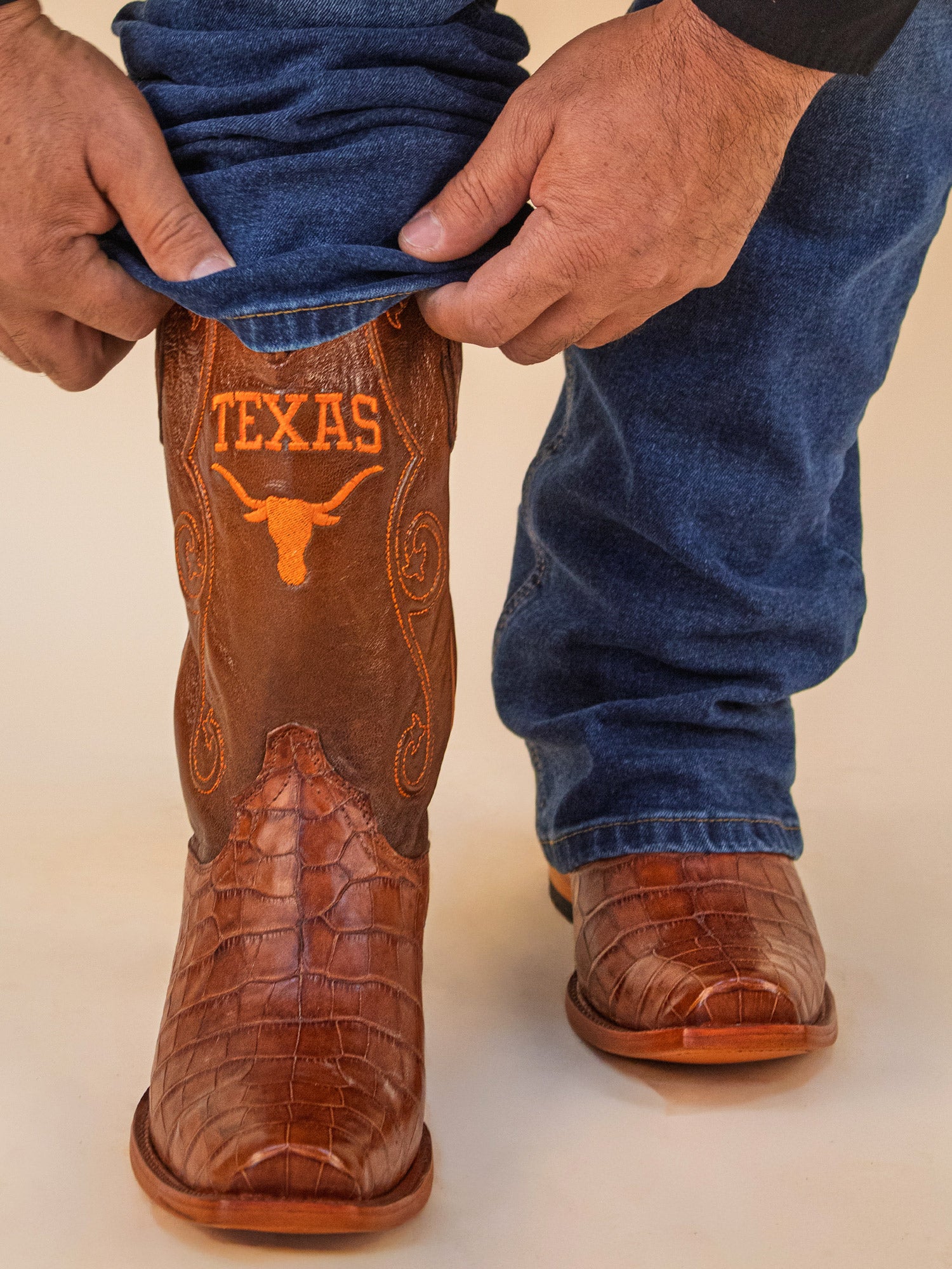 The James cowboy boots are the ultimate choice for fans looking to elevate their game day style. Featuring a classic hand-corded upper and exotic American Alligator vamp, they perfectly blend tradition luxury, and Longhorns pride. Step up your style and stand out in the stands. Hook 'Em Horns!