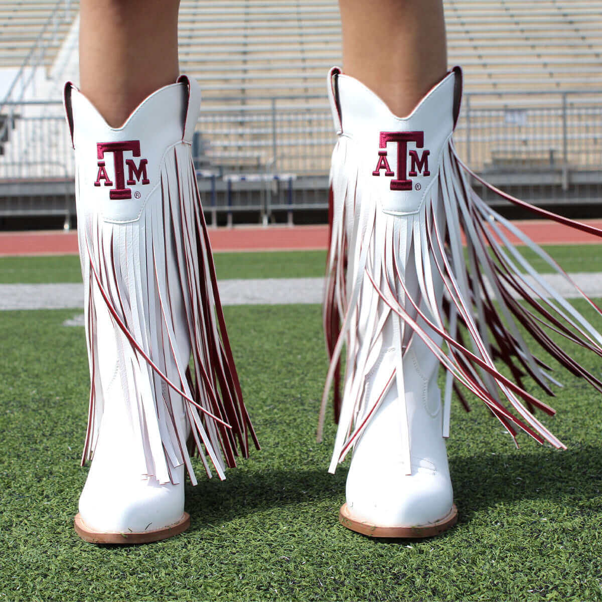 Show your Aggie pride in style with the Kacey cowgirl boots, officially licensed for Texas A&M University. Featuring playful fringe that reveals bold school colors, these PU leather boots are a fun, budget-friendly way to stand out at tailgates or on the dance floor.