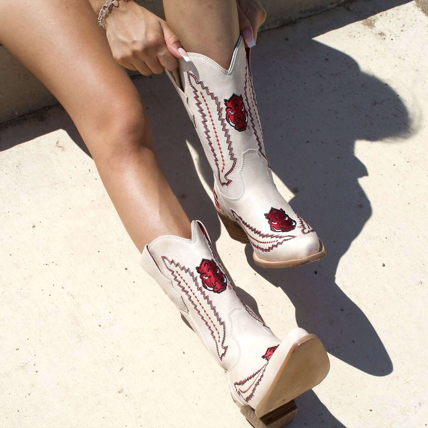 Show your Razorback pride in style with the Kacey cowgirl boots, officially licensed for The University of Arkansas. Featuring playful fringe that reveals bold school colors, these PU leather boots are a fun, budget-friendly way to stand out at tailgates or on the dance floor.
