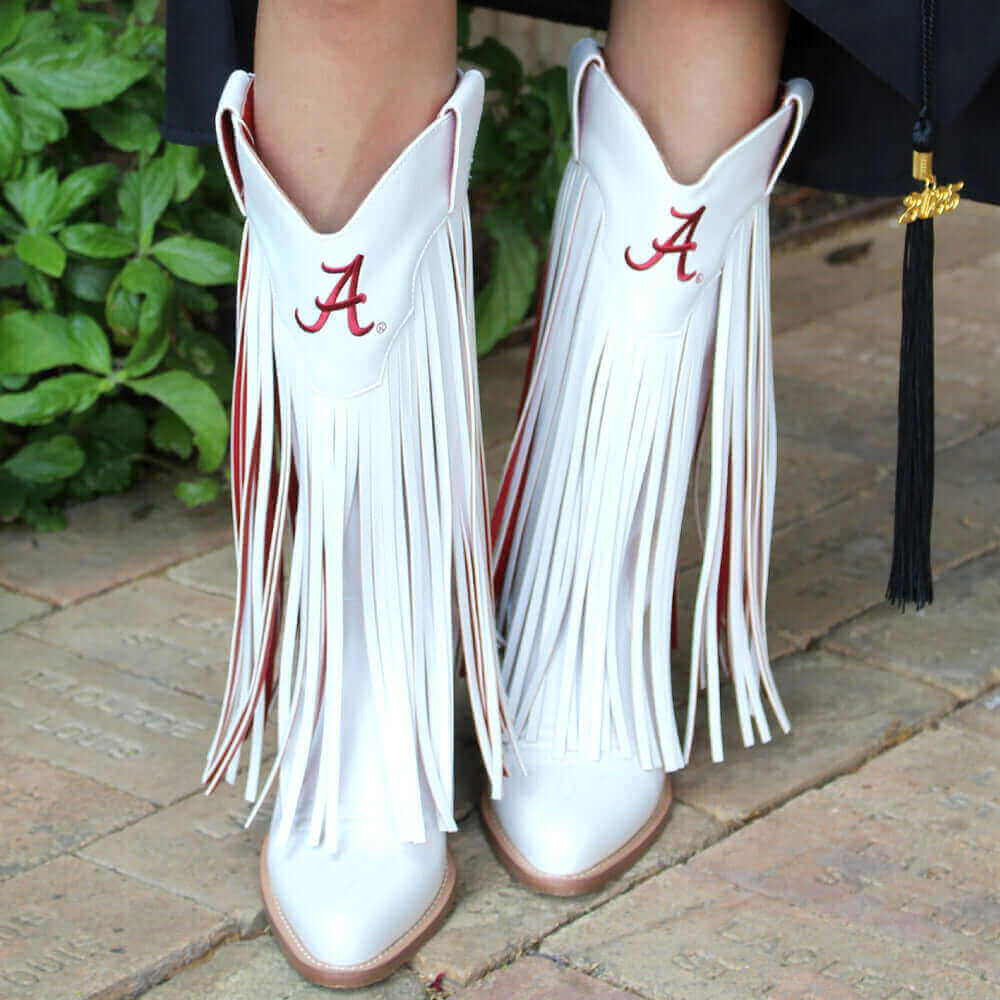 Show your Crimson Tide pride in style with the Kacey cowgirl boots, officially licensed for The University of Alabama. Featuring playful fringe that reveals bold school colors, these PU leather boots are a fun, budget-friendly way to stand out at tailgates or on the dance floor.