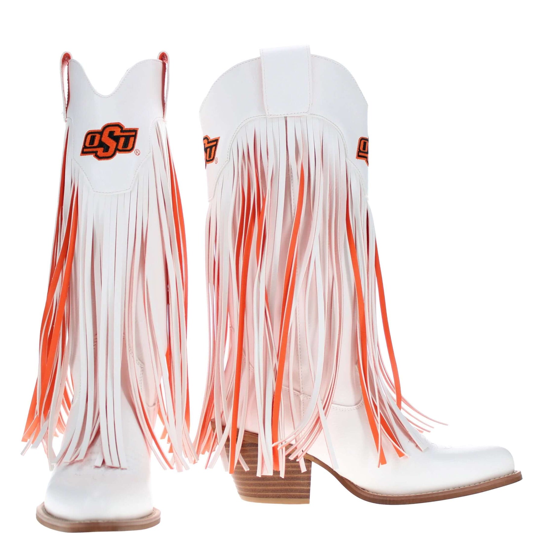 Show your Cowboy pride in style with the Kacey cowgirl boots, officially licensed for Oklahoma State University. Featuring playful fringe that reveals bold school colors, these PU leather boots are a fun, budget-friendly way to stand out at tailgates or on the dance floor.