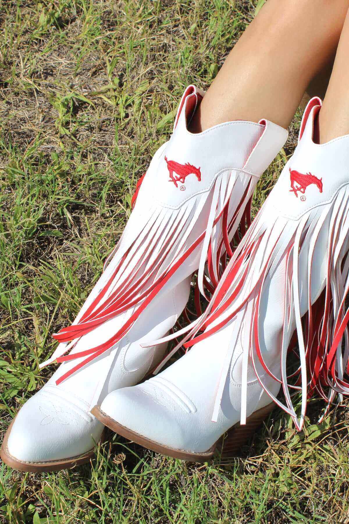 Show your Mustangs pride in style with the Kacey cowgirl boots, officially licensed for Southern Methodist University. Featuring playful fringe that reveals bold school colors, these PU leather boots are a fun, budget-friendly way to stand out at tailgates or on the dance floor.