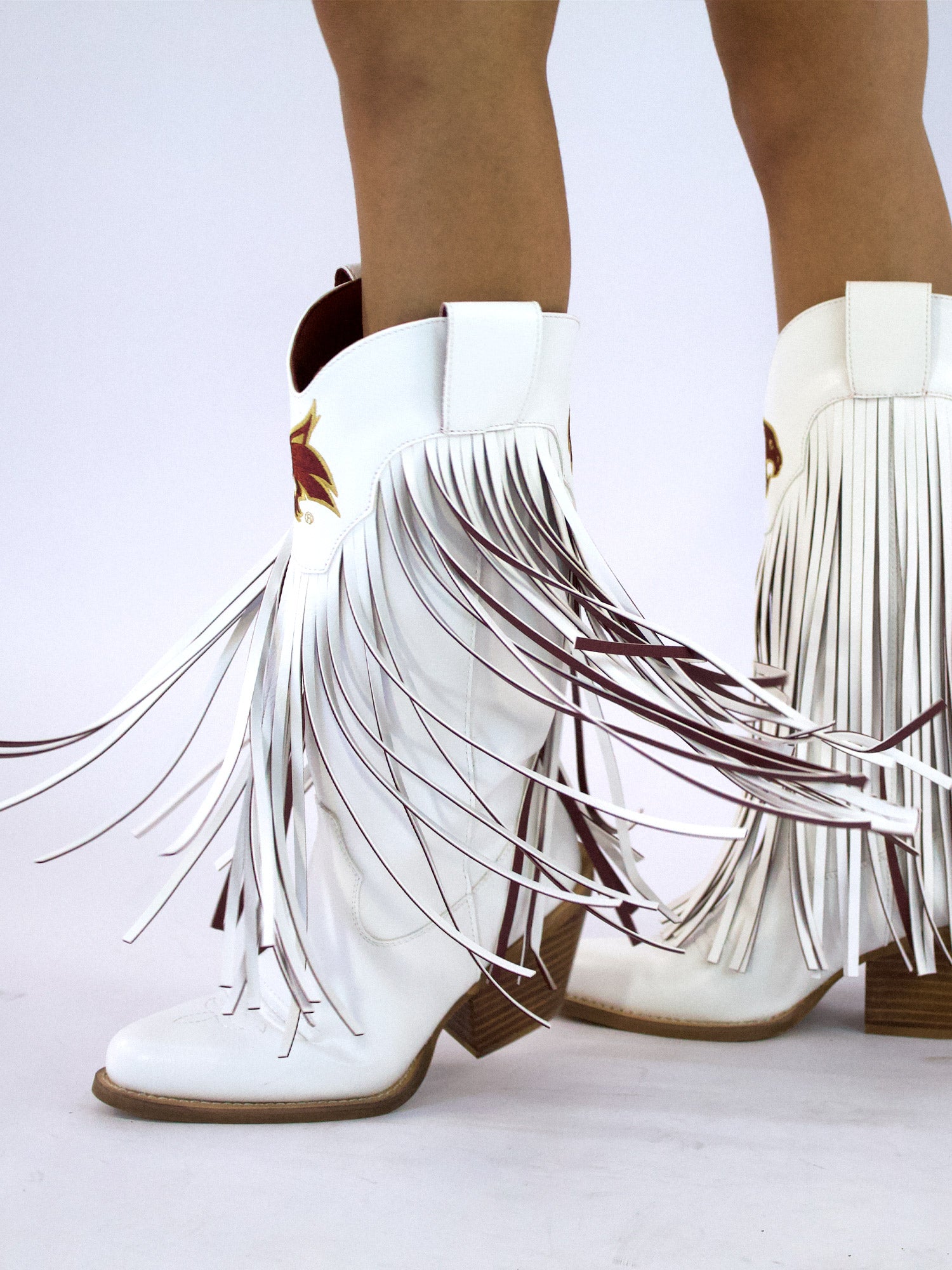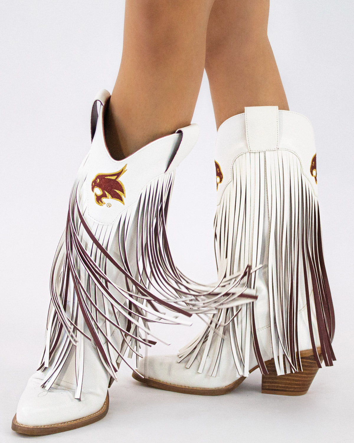 Show your Bobcat pride in style with the Kacey cowgirl boots, officially licensed for Texas State University. Featuring playful fringe that reveals bold school colors, these PU leather boots are a fun, budget-friendly way to stand out at tailgates or on the dance floor.