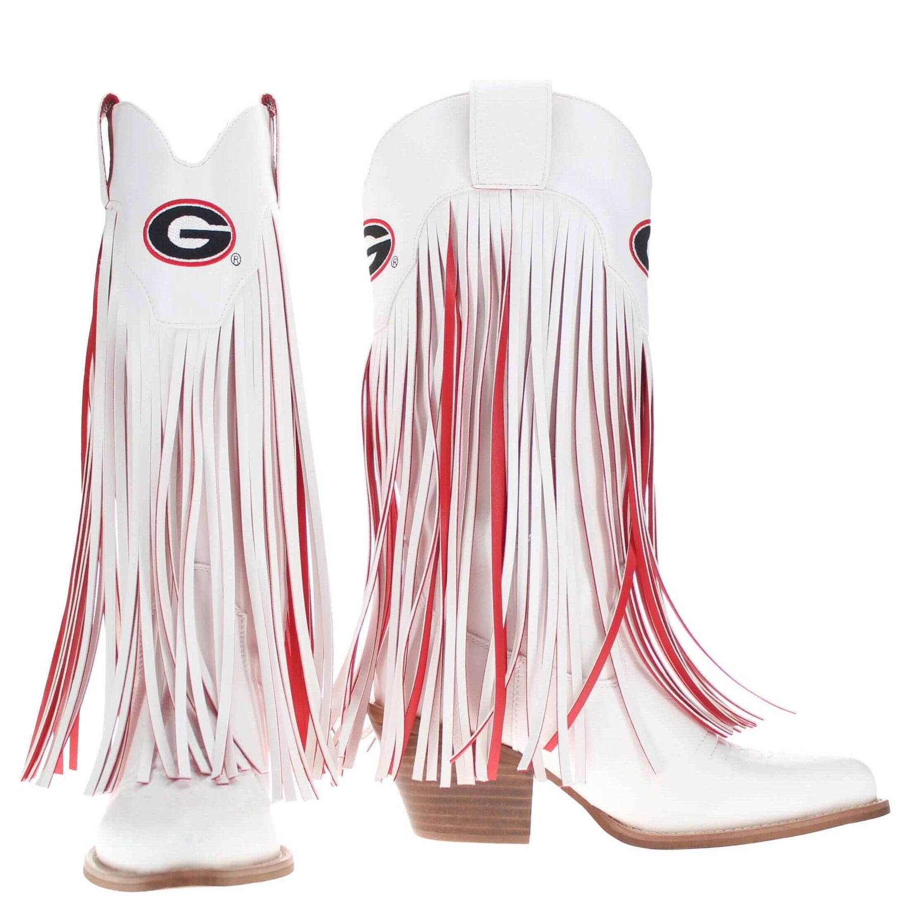 Show your Bulldogs pride in style with the Kacey cowgirl boots, officially licensed for The University of Georgia. Featuring playful fringe that reveals bold school colors, these PU leather boots are a fun, budget-friendly way to stand out at tailgates or on the dance floor.