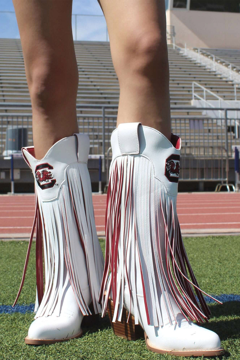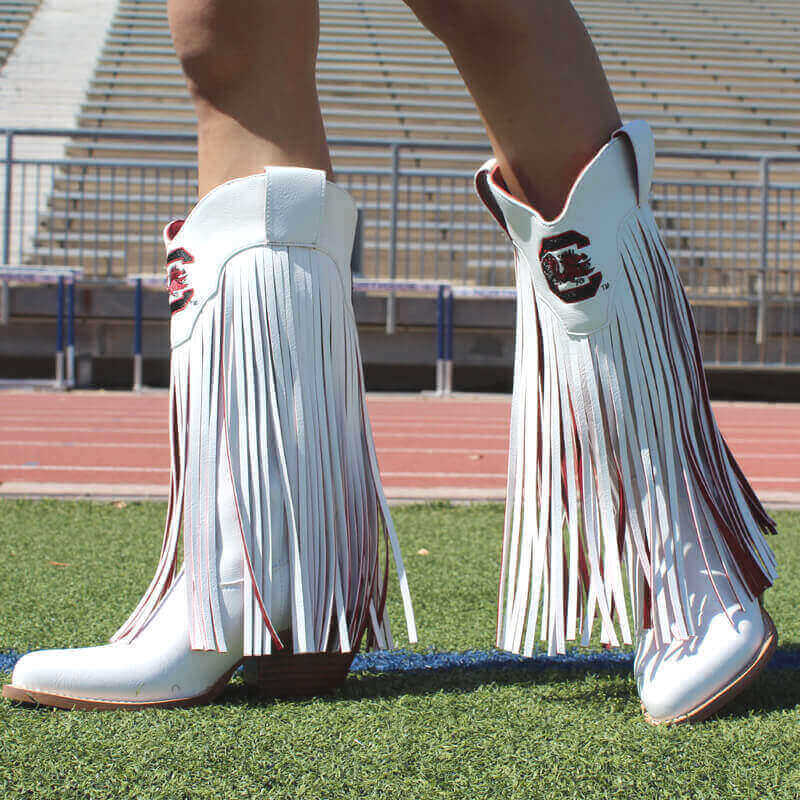 Show your Gamecock pride in style with the Kacey cowgirl boots, officially licensed for The University of South Carolina. Featuring playful fringe that reveals bold school colors, these PU leather boots are a fun, budget-friendly way to stand out at tailgates or on the dance floor.