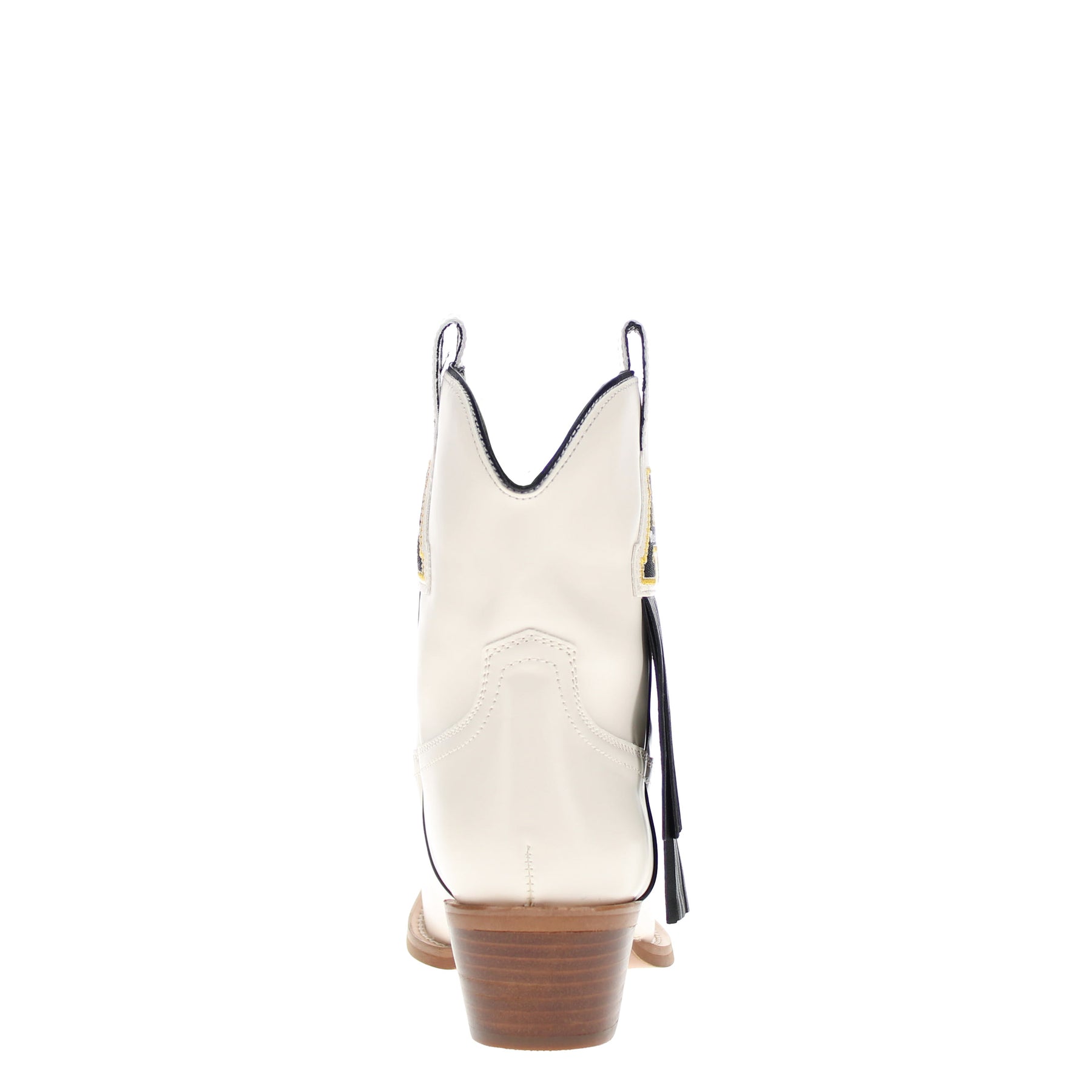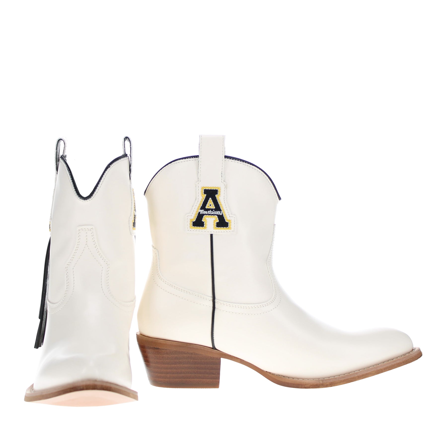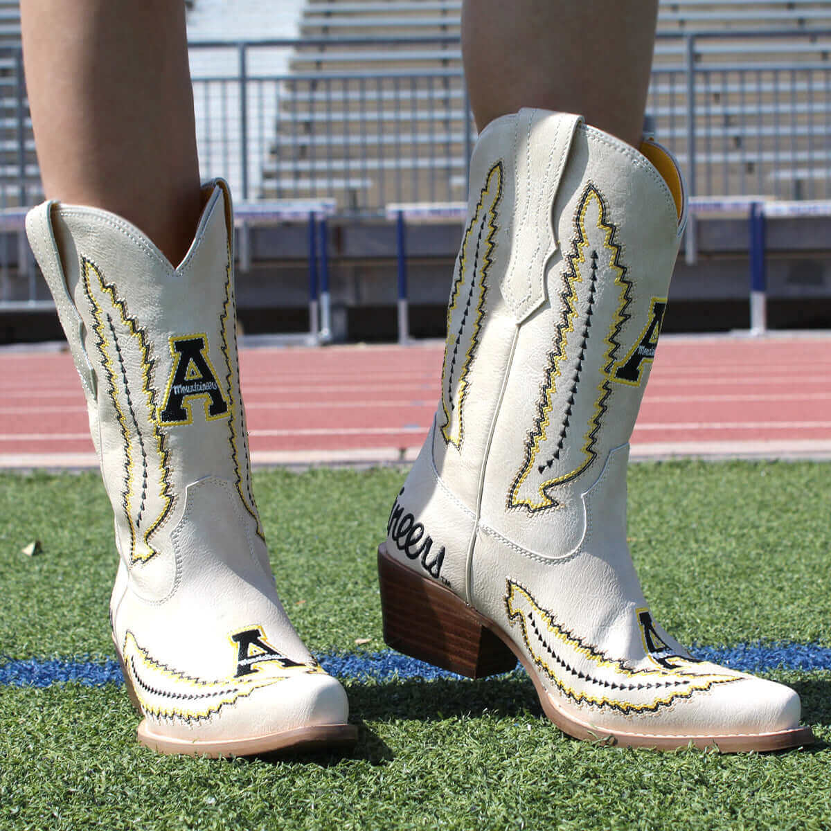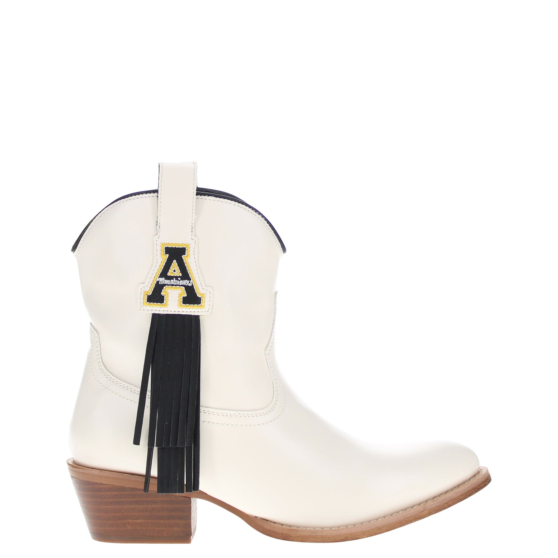 Meet the Lucy, a bold new take on western tradition. Officially licensed for Appalachian State University. The Lucy pairs sleek bone PU leather with the Appalachian State logo and playful fringe for a standout game day look. With its modern silhouette and stacked heel, this boot delivers both comfort and style for every occasion. Go Mountaineers!