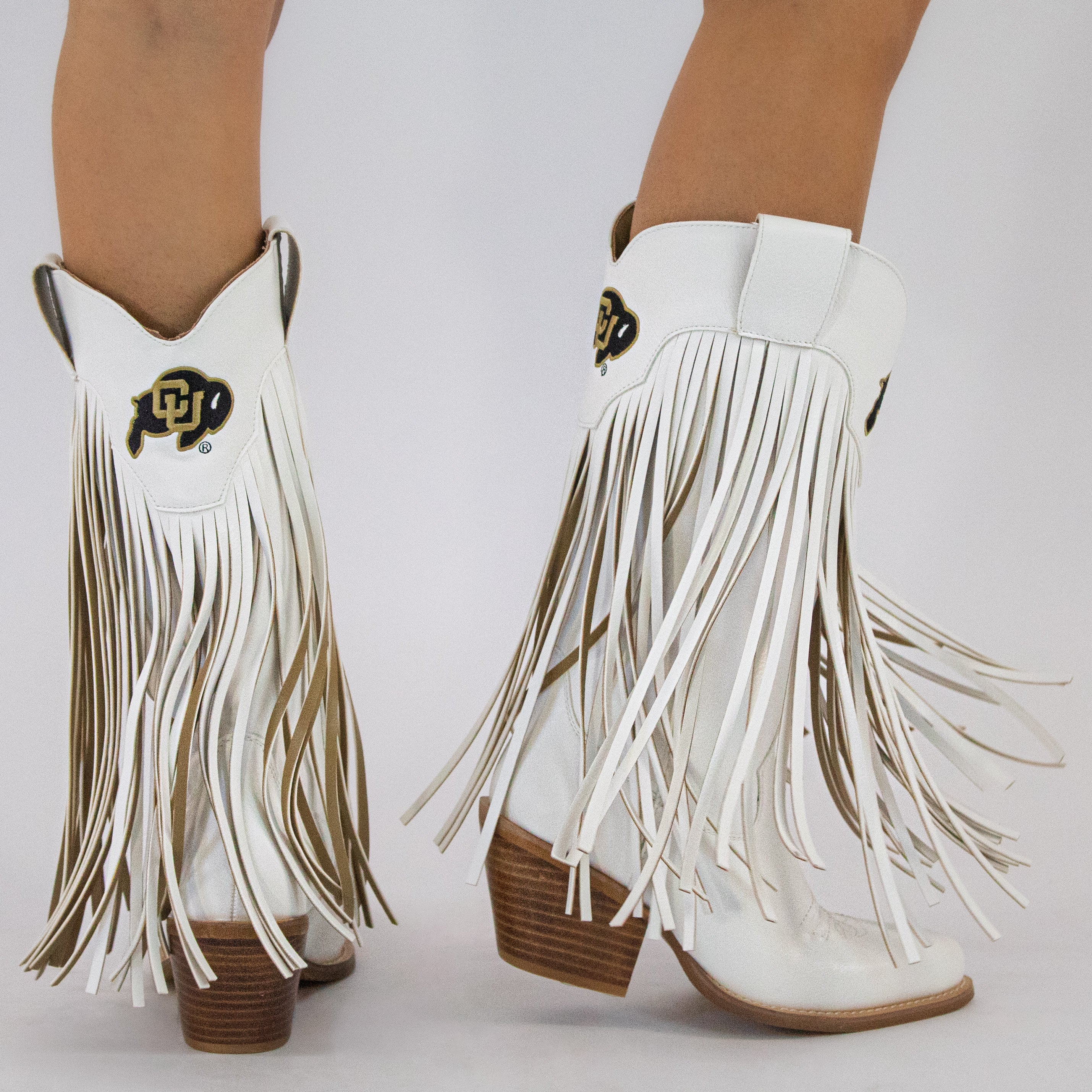 Meet the Lucy, a bold new take on western tradition. Officially licensed for The University of Colorado. The Lucy pairs sleek bone PU leather with the Colorado logo and playful fringe for a standout game day look. With its modern silhouette and stacked heel, this boot delivers both comfort and style for every occasion. Go Buffs!
