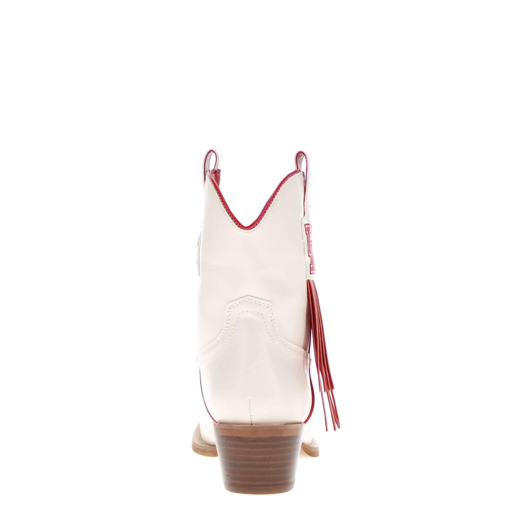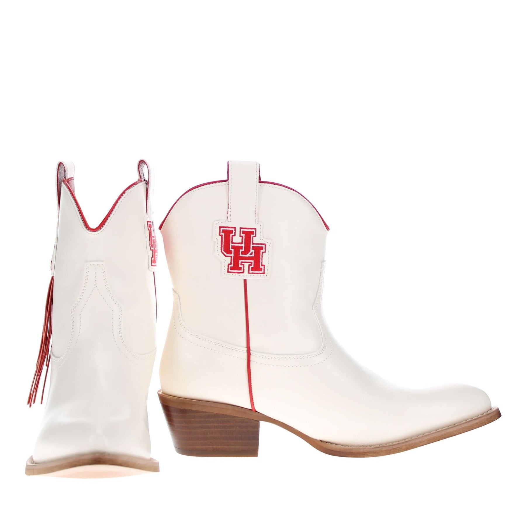 Meet the Lucy, a bold new take on western tradition. Officially licensed for The University of Houston. The Lucy pairs sleek bone PU leather with the Houston logo and playful fringe for a standout game day look. With its modern silhouette and stacked heel, this boot delivers both comfort and style for every occasion. Go Cougars!