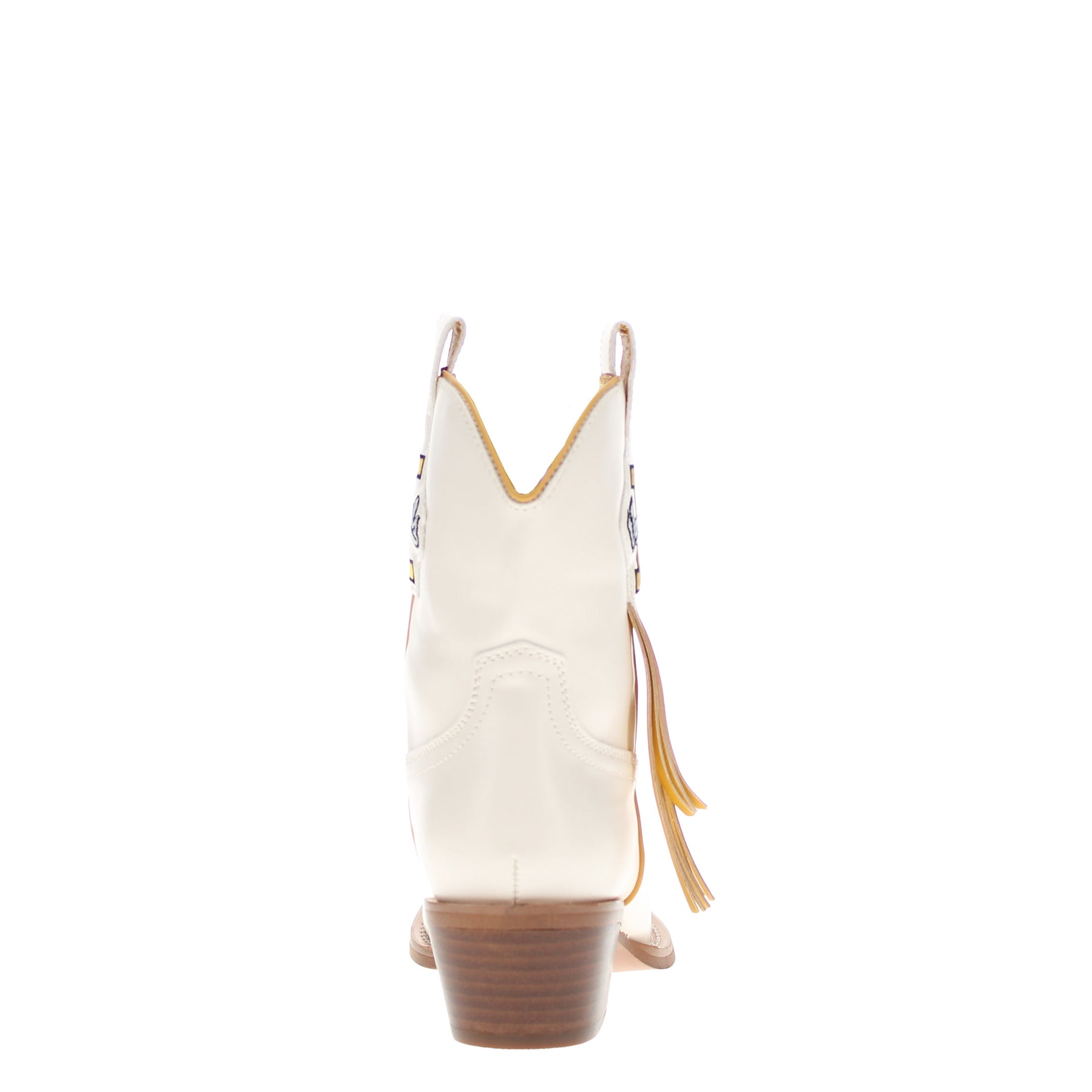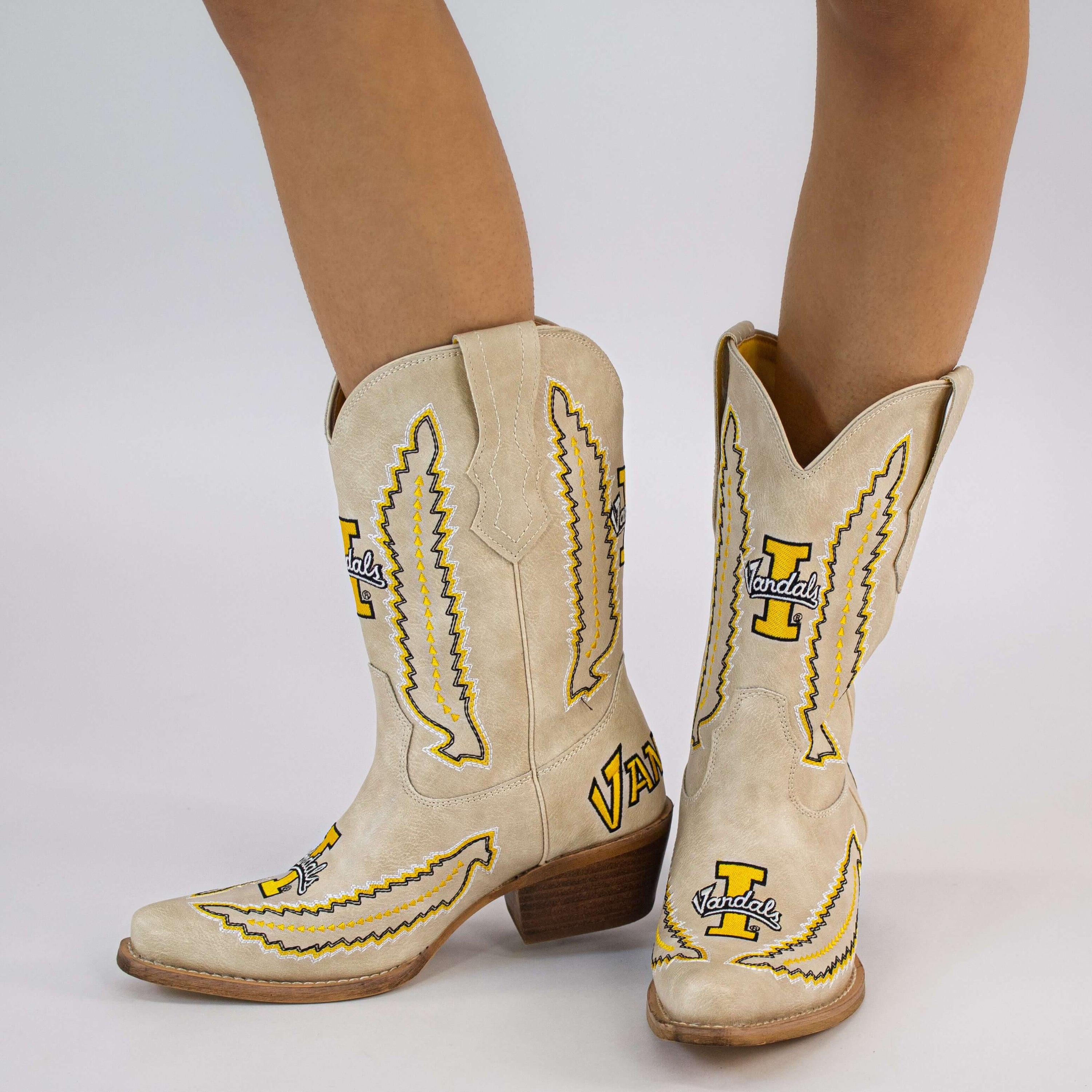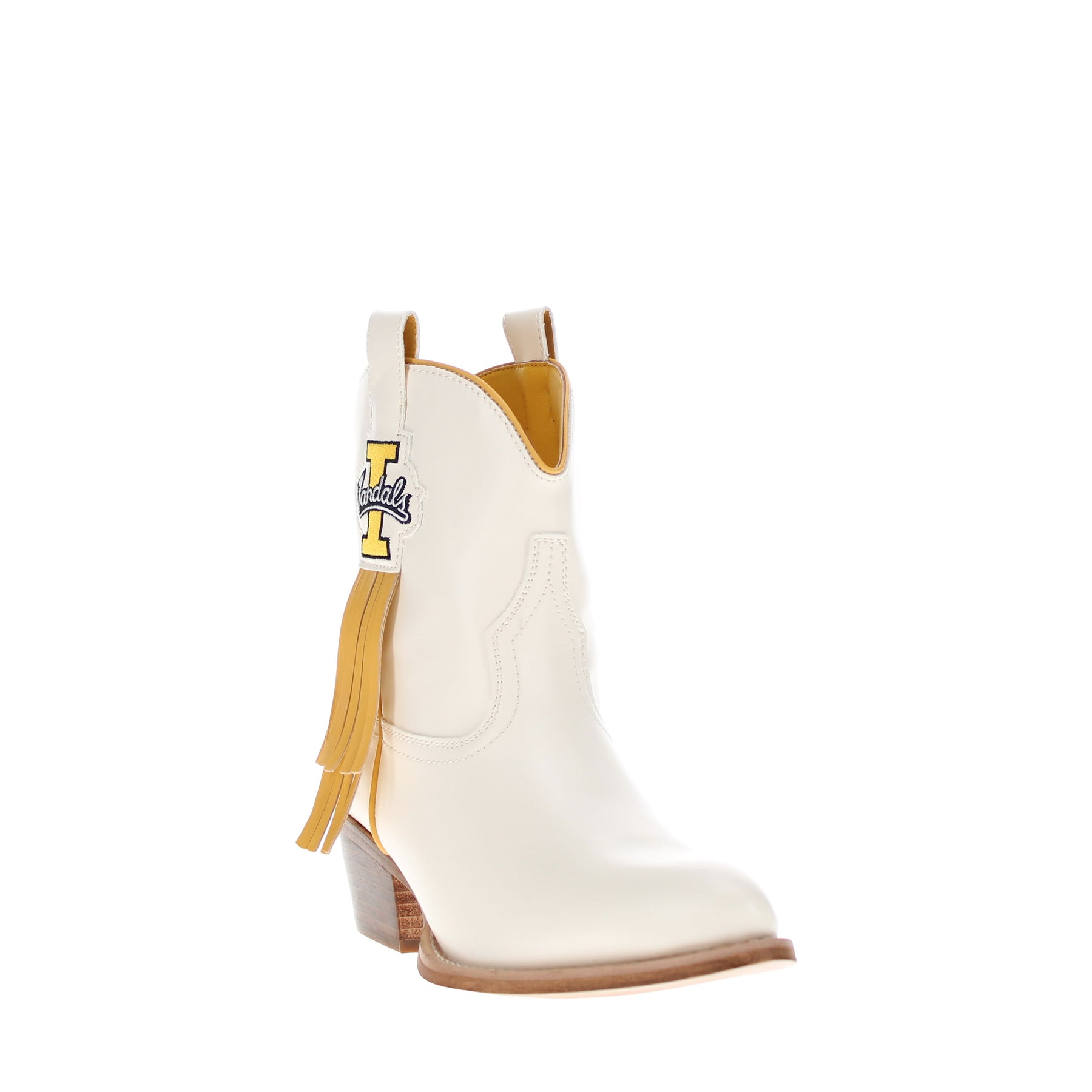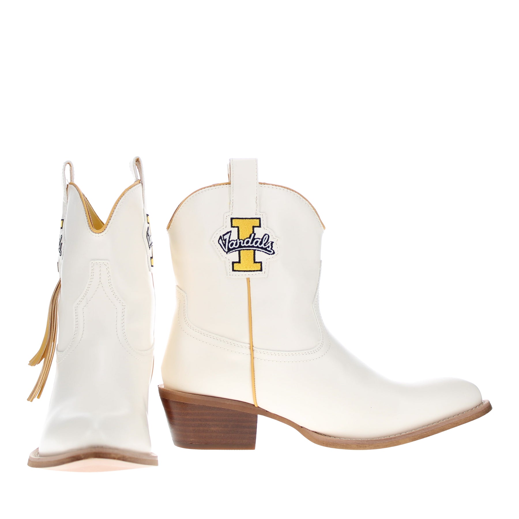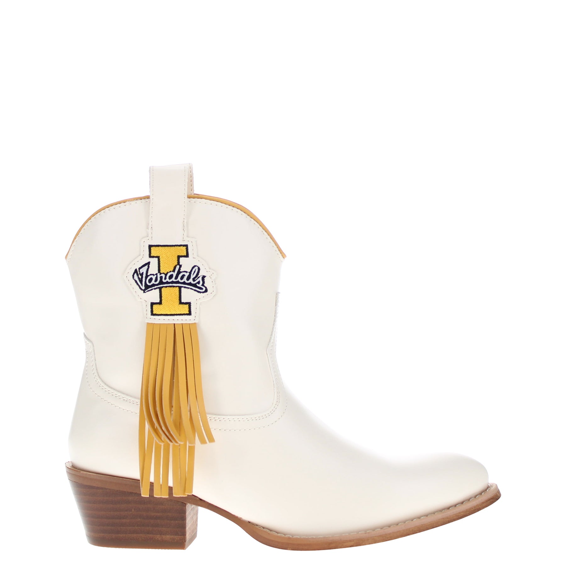 Meet the Lucy, a bold new take on western tradition. Officially licensed for The University of Idaho. The Lucy pairs sleek bone PU leather with the Idaho logo and playful fringe for a standout game day look. With its modern silhouette and stacked heel, this boot delivers both comfort and style for every occasion. Go Vandals!