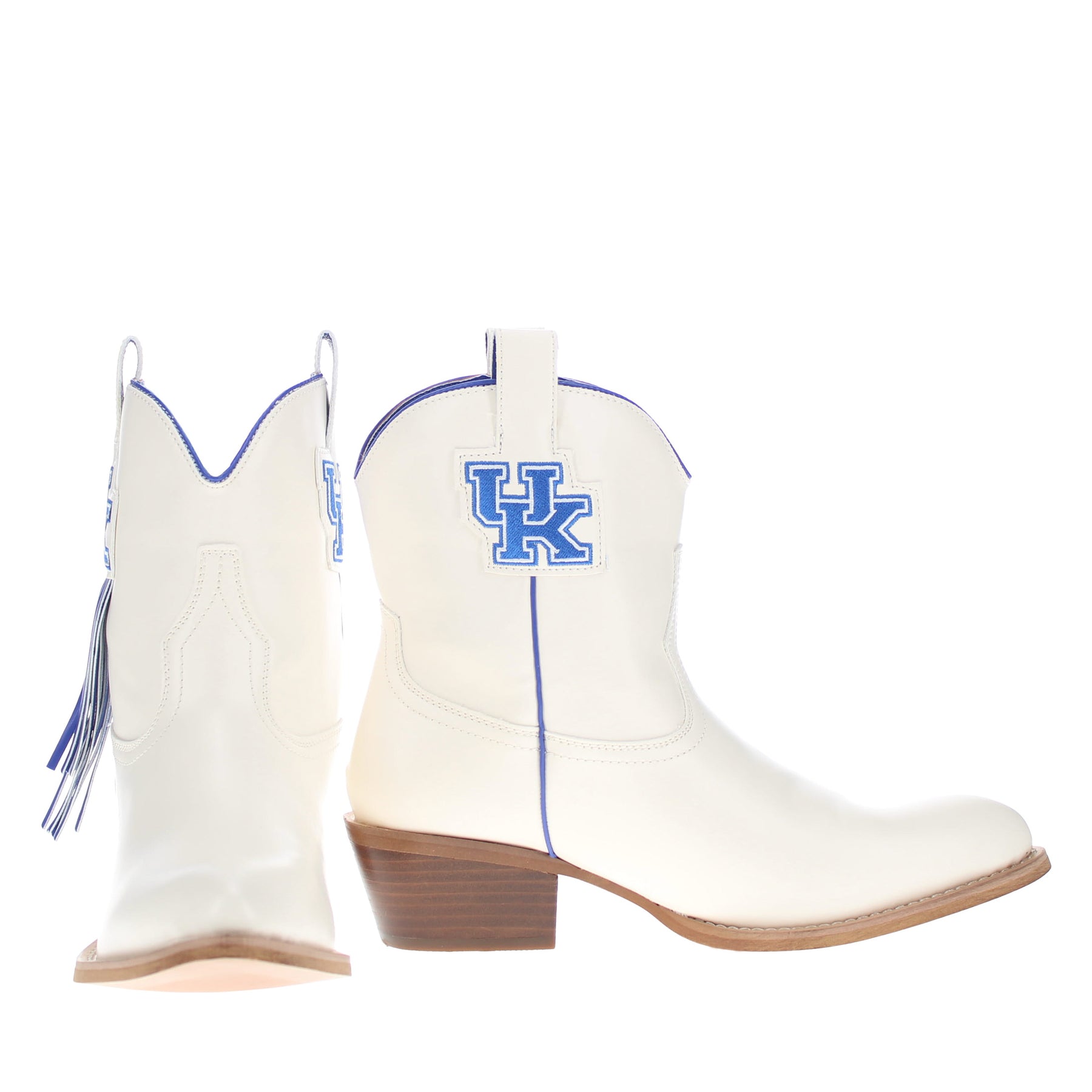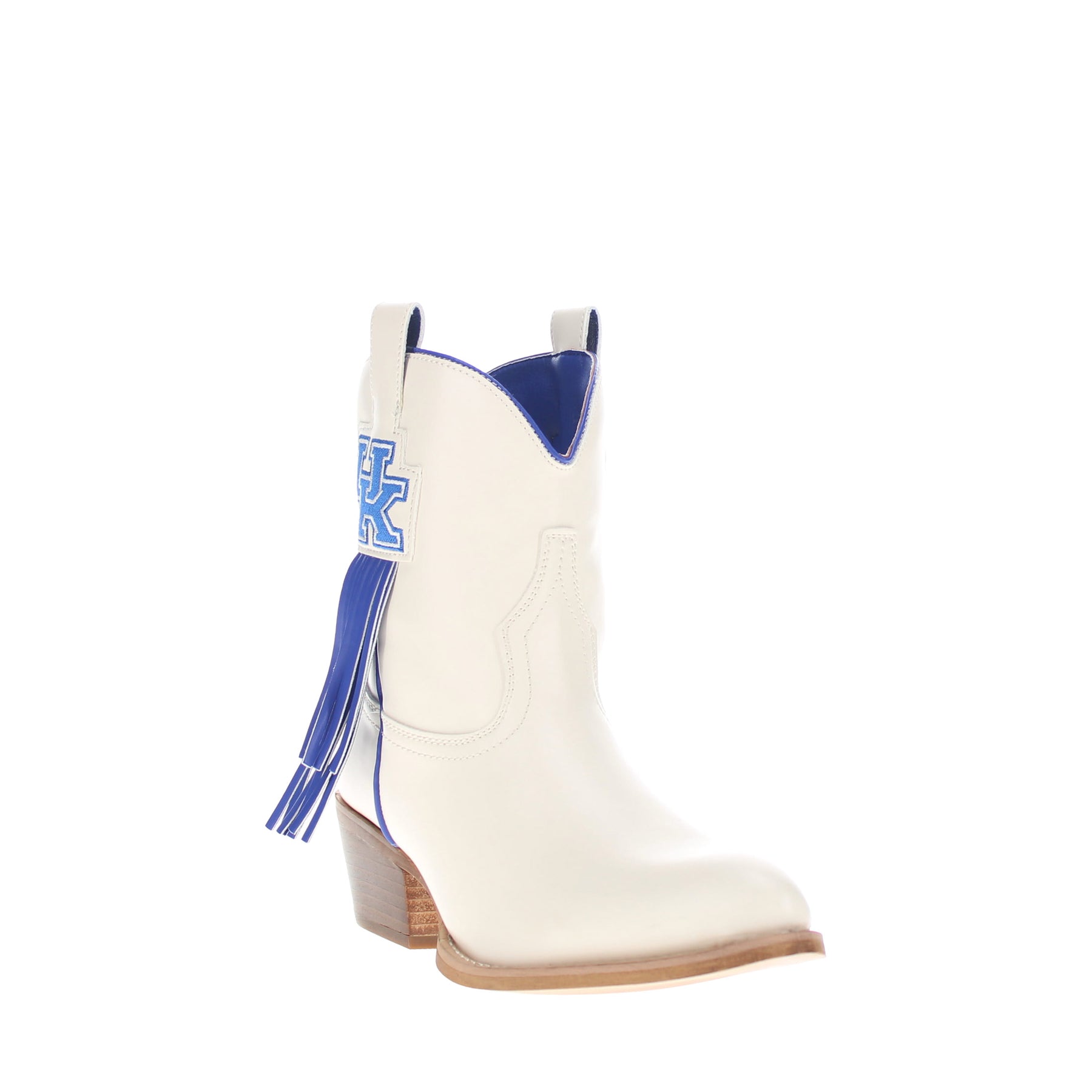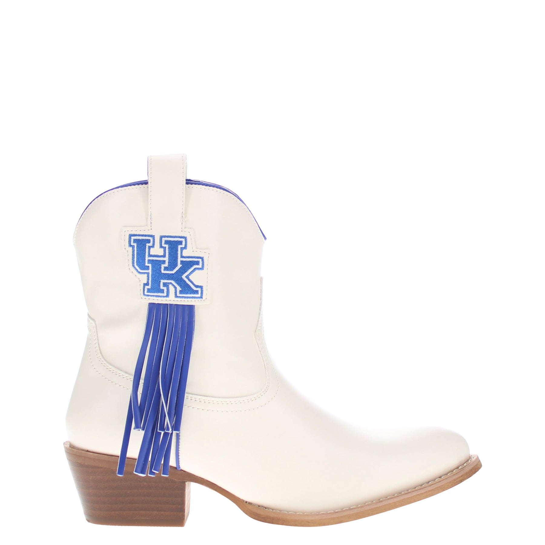 Meet the Lucy, a bold new take on western tradition. Officially licensed for The University of Kentucky. The Lucy pairs sleek bone PU leather with the Kentucky logo and playful fringe for a standout game day look. With its modern silhouette and stacked heel, this boot delivers both comfort and style for every occasion. Go Wildcats!