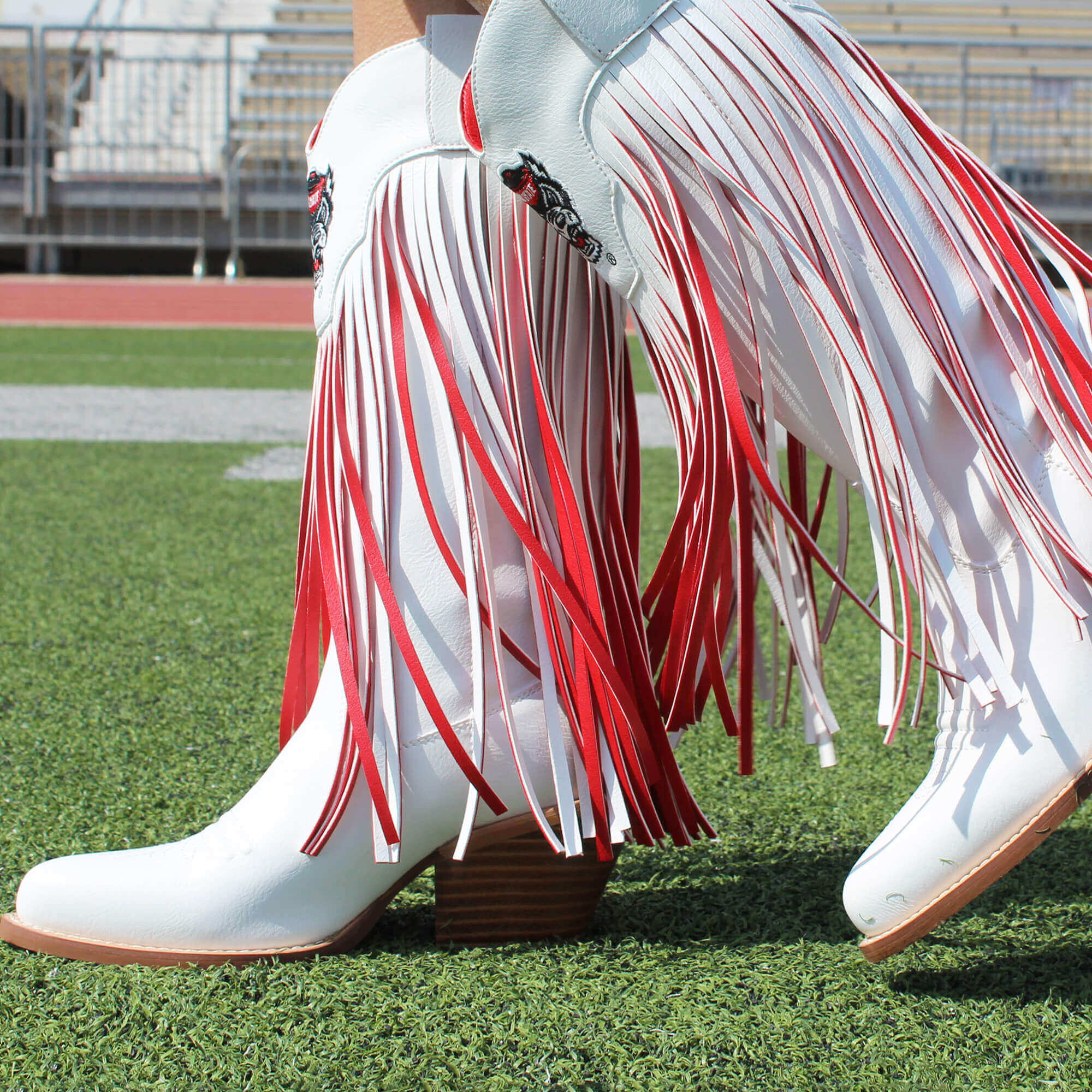Meet the Lucy, a bold new take on western tradition. Officially licensed for North Carolina State University. The Lucy pairs sleek bone PU leather with the NC State logo and playful fringe for a standout game day look. With its modern silhouette and stacked heel, this boot delivers both comfort and style for every occasion. Go Wolkpack!