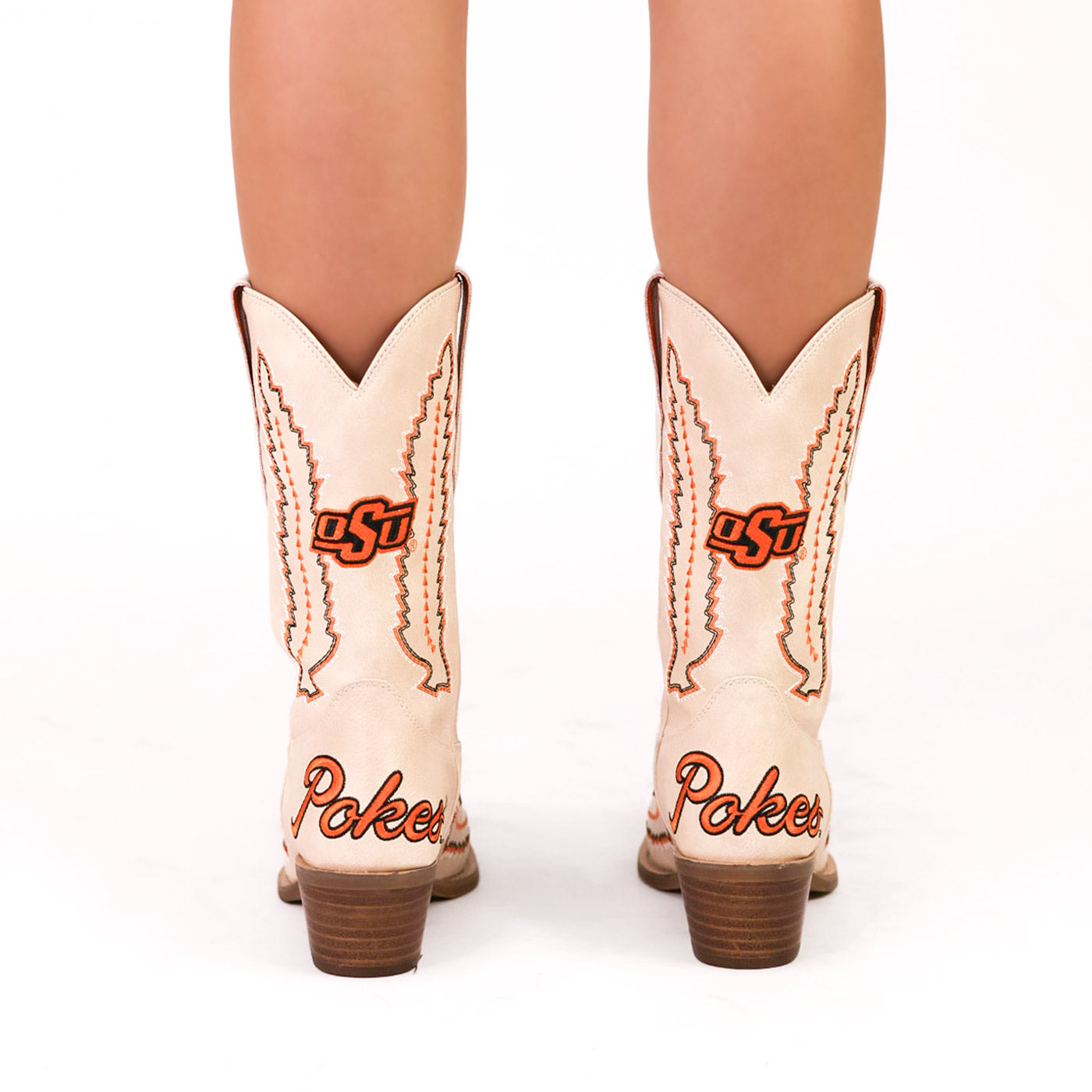 Meet the Lucy, a bold new take on western tradition. Officially licensed for Oklahoma State University. The Lucy pairs sleek bone PU leather with the OSU logo and playful fringe for a standout game day look. With its modern silhouette and stacked heel, this boot delivers both comfort and style for every occasion. Go Pokes!