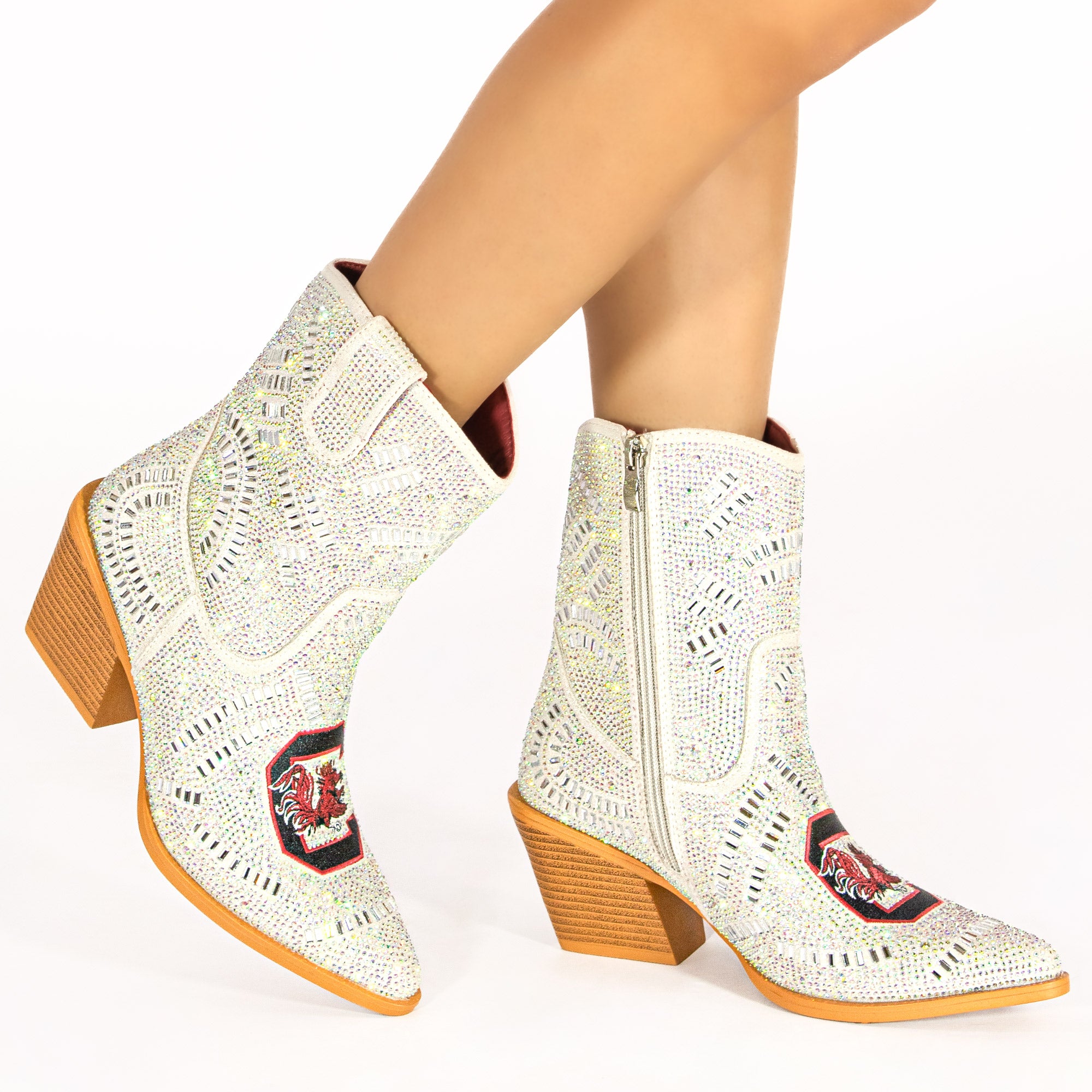 Meet the Lucy, a bold new take on western tradition. Officially licensed for The University of South Carolina. The Lucy pairs sleek bone PU leather with the South Carolina logo and playful fringe for a standout game day look. With its modern silhouette and stacked heel, this boot delivers both comfort and style for every occasion. Go Gamecocks!