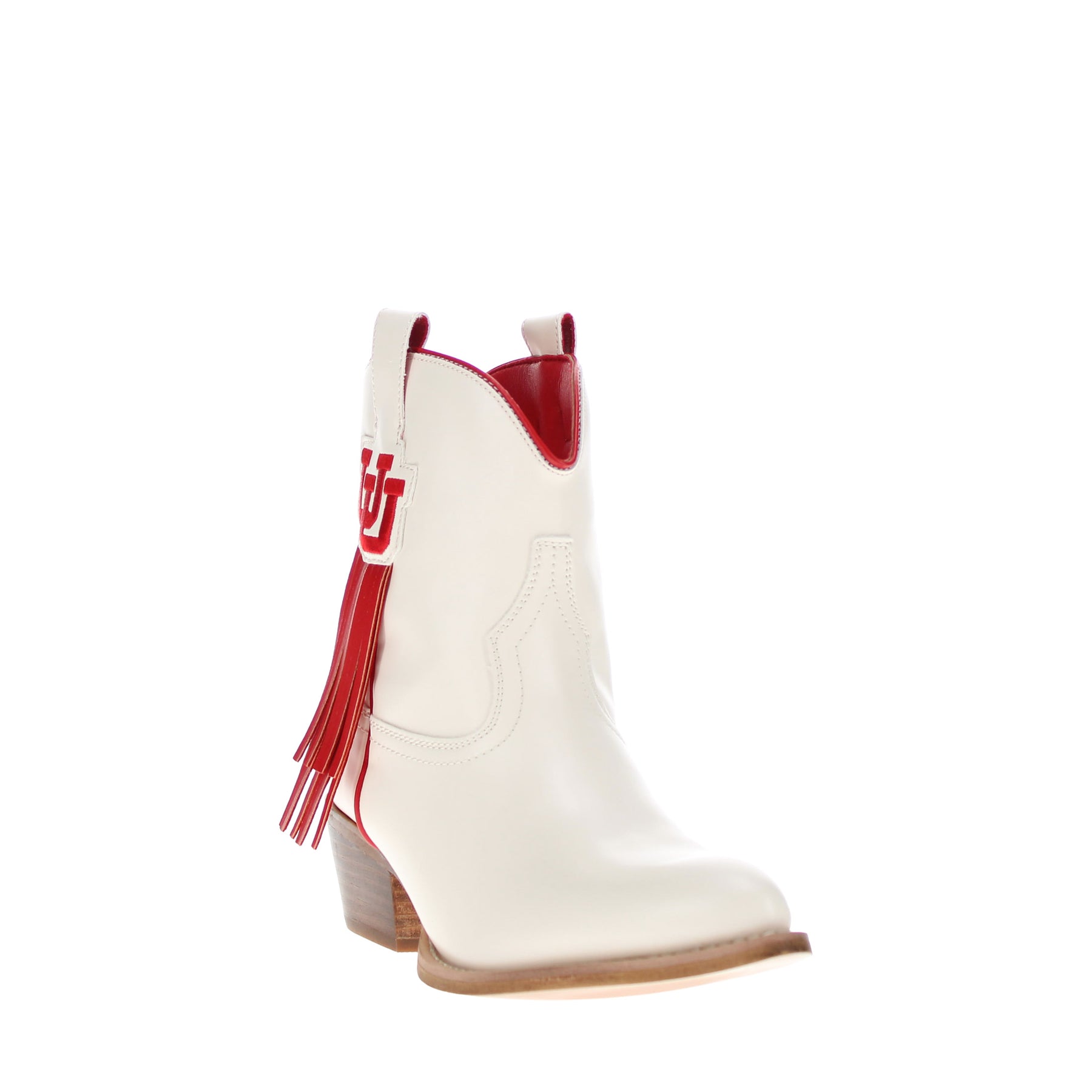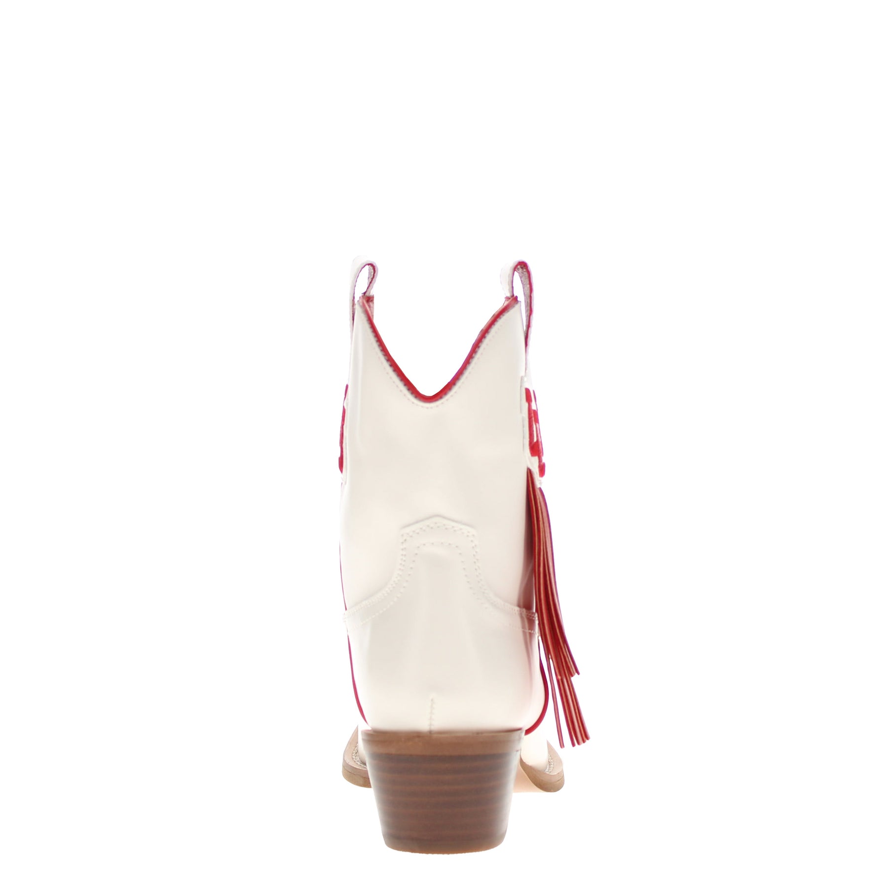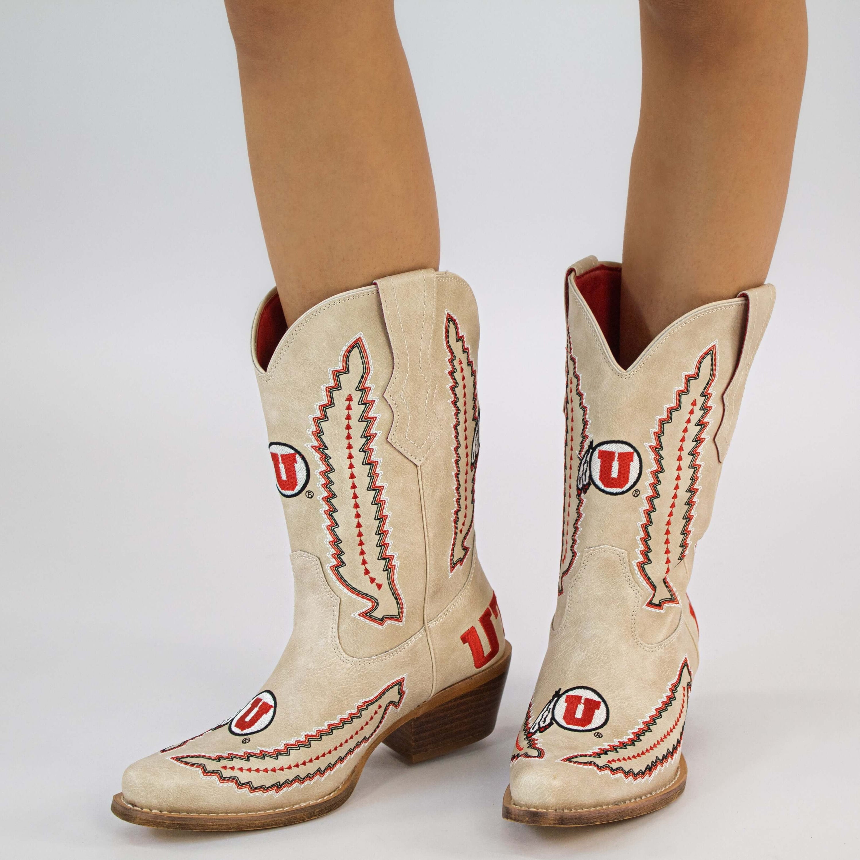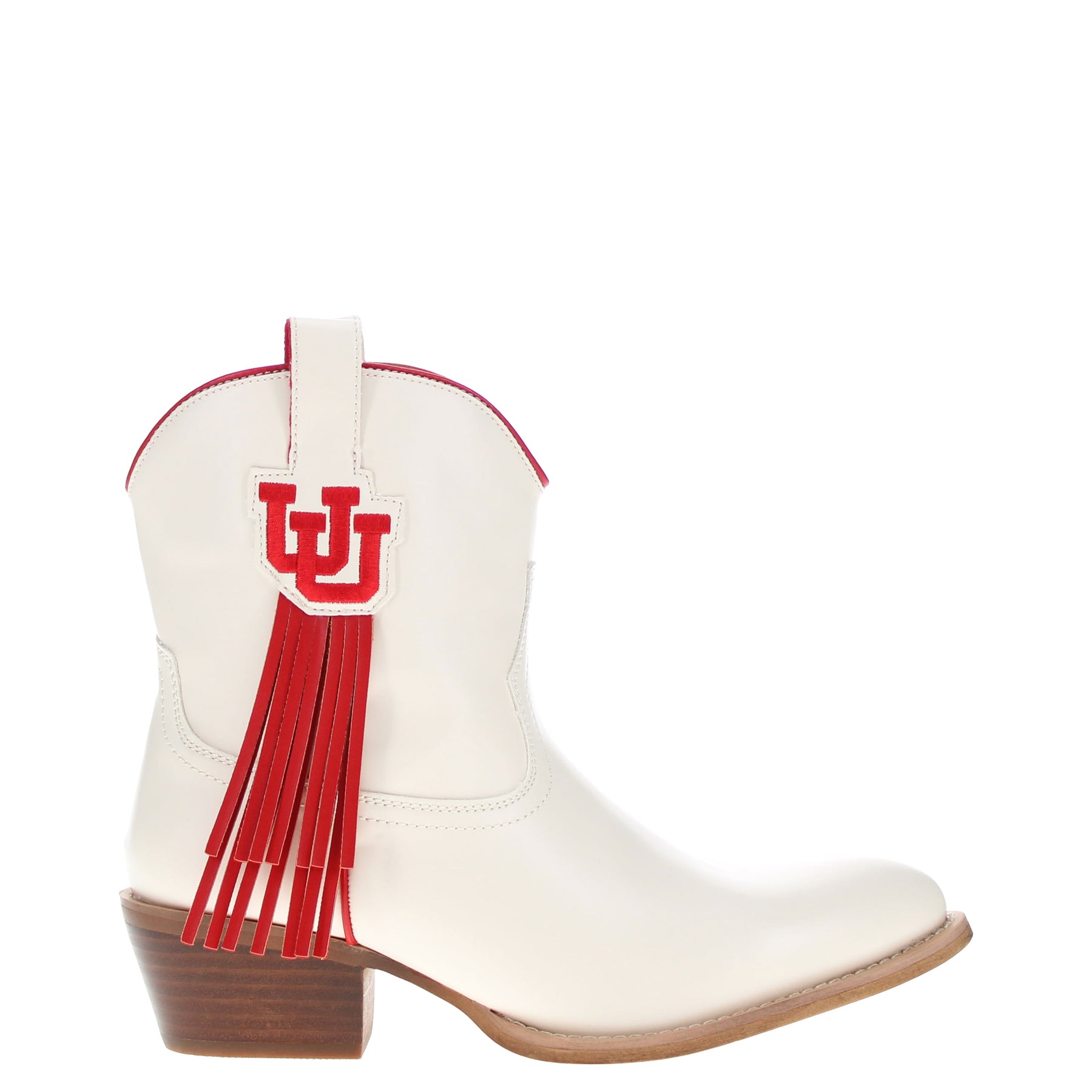 Meet the Lucy, a bold new take on western tradition. Officially licensed for The University of Utah. The Lucy pairs sleek bone PU leather with the Utah logo and playful fringe for a standout game day look. With its modern silhouette and stacked heel, this boot delivers both comfort and style for every occasion. Go Utes!