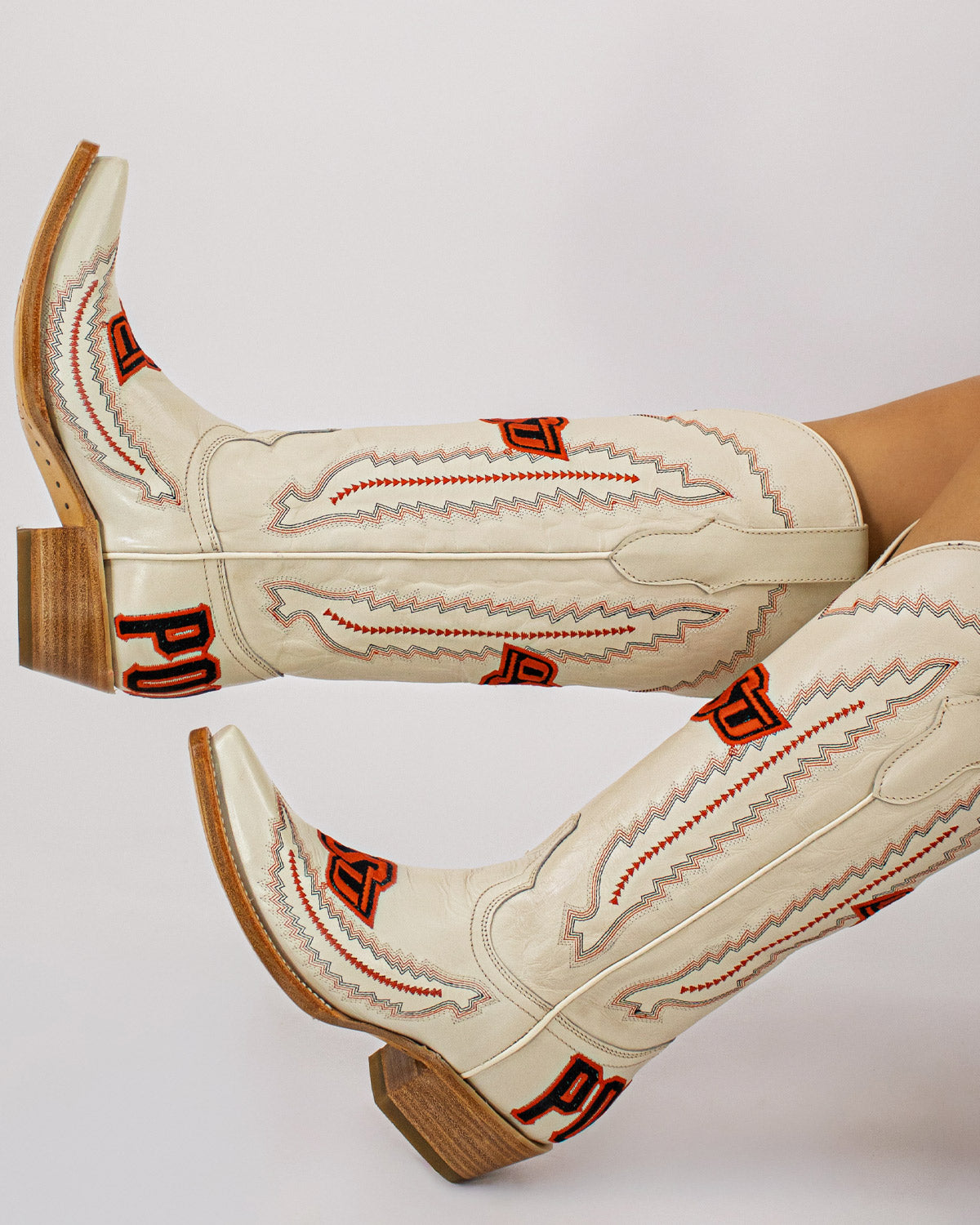Our best seller for a reason, The Naomi is the perfect mix of school pride and Southern charm. Featuring vibrant orange and black stitch patterns and officially licensed logos, these boots are designed to stand out on game day and beyond. More than just footwear, they’re a bold expression of your Cowboys spirit with every step. Go Pokes!