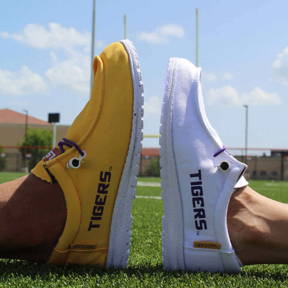 Take your Tigers pride to the next level with the Nate, officially licensed for Louisiana State University. This casual slip-on shoes is made with breathable canvas and features a lightweight flexible outsole and elastic laces. Both comfortable and stylish, these slip-on shoes feature officially licensed logos for a touch of school spirit. Whether you're cheering in the stands on gameday or walking around campus, the lightweight construction and cushioned insoles ensure all day comfort. Geaux Tigers!
