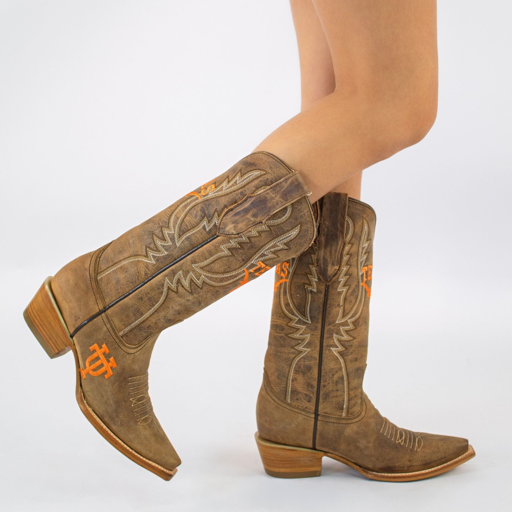 Paige cowgirl boots blend timeless western style with school spirit, featuring university logos on the upper and foot, perfect for pairing with jeans while still repping your team spirit. Designed for both style and comfort, they're perfect for game days, two-stepping, and everything in between.